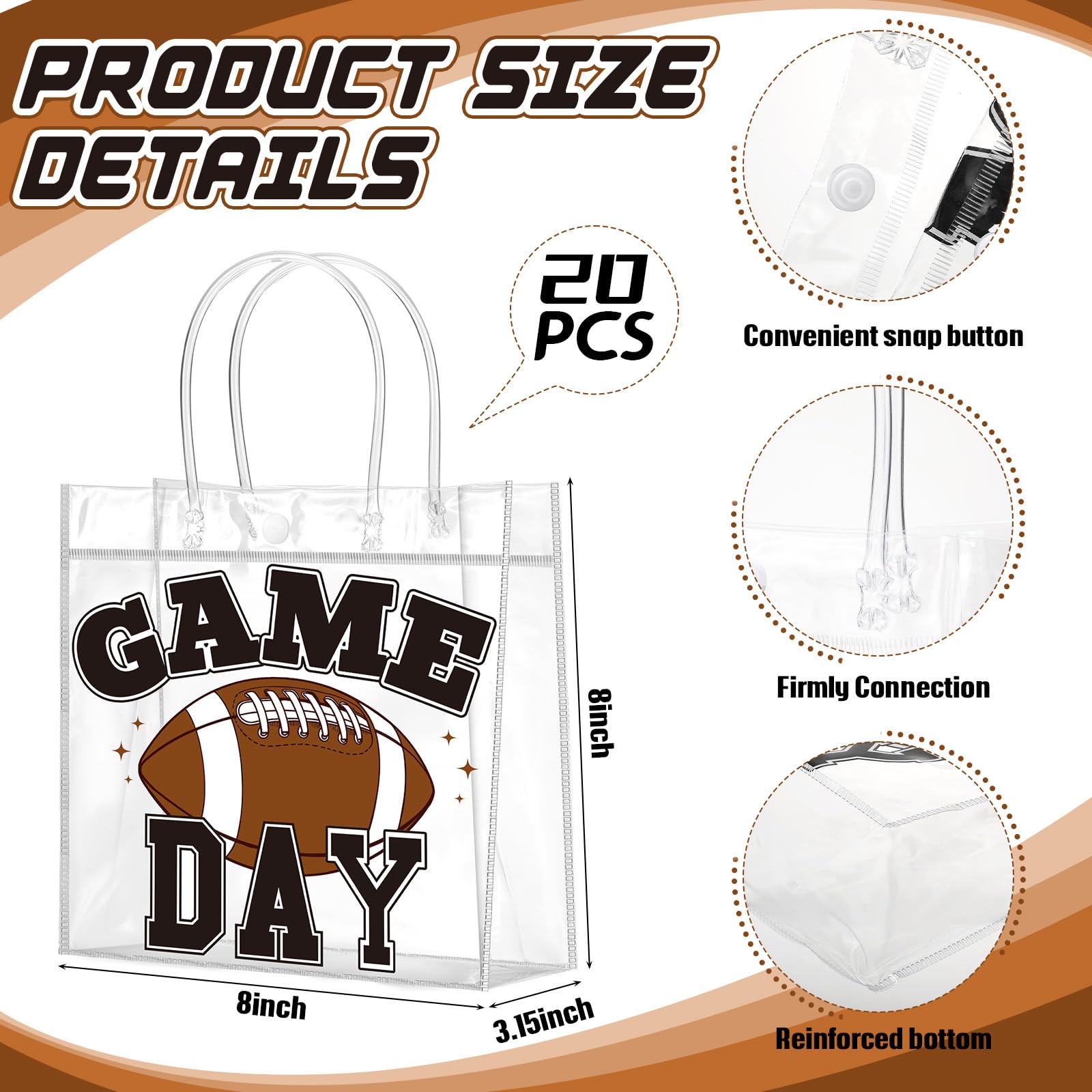 Features: Lightweight and easy to stack, they're ideal for travel, locker room storage, or event setups. Whether you're prepping for a tournament weekend or organizing a themed birthday party, these bags keep your essentials secure and organized without bulk. Whether you're rewarding players after a big game, sharing party favors at a birthday, or fostering team camaraderie, each bag is ready to be filled with candies, toys, or personalized notes, making them a practical and joyful solution for spreading smiles on and off the field. Specifications: Material: pp Color: clear Size: 8 x 8 x 3.15 inches/ 20 x 20 x 8 cm Package includes: 20 x Football goodie bags Notes: Manual measurement, please allow slight errors on size. The color may exist a slight difference due to different screen displays.