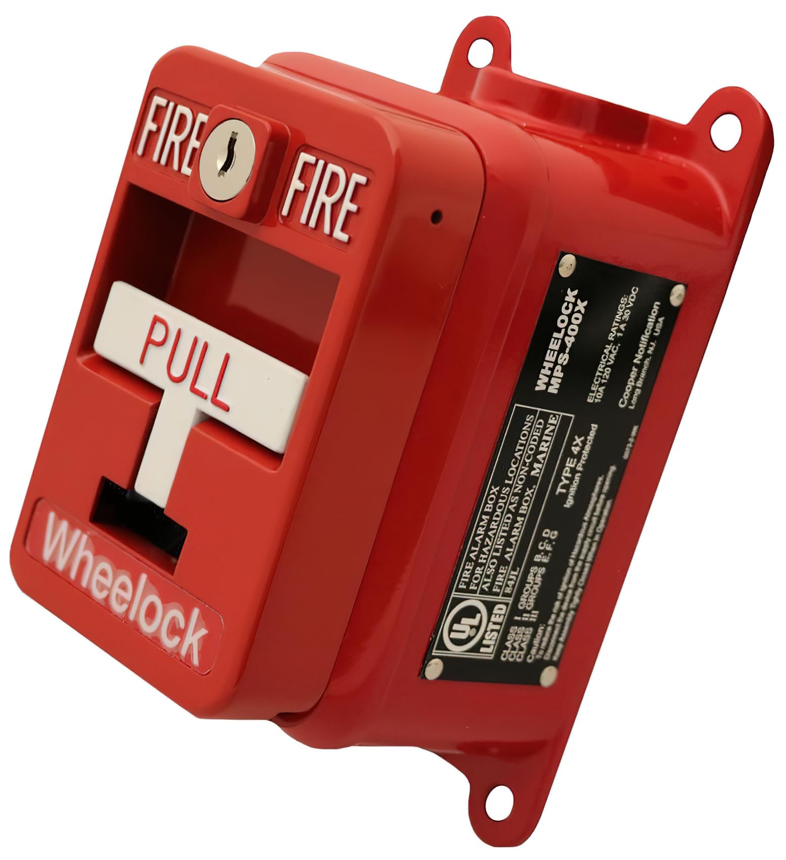 Wheelock MPS-400X Manual Pull Station, Red, Single Action, Explosion-proof, Key Reset, High-gloss Red Enamel Finish with Raised White Lettering, Indoor and Outdoor, Wall Mounting MPS non-coded manual pull stations are constructed of high-quality, die-cast metal for long-lasting performance and may be mounted on a single gang backbox. Available in either single or dual action configurations for indoor or outdoor use with SPST contacts and terminal strip connections. The normally open contact will close when the pull station is activated and is rated for 30 VDC @ 1 amp and/or 120 VAC @ 1 amp. The contacts are gold-plated to avoid the risk of corrosion. KEY FEATURES - Single action - Key reset - Terminal strip connections - Corrosion-resistant, gold-plated SPST contacts - Mounts on single gang backbox - Surface and weatherproof backboxes available - Plastic breakrod - High-gloss red enamel finish with raised white lettering - Approvals include: UL Standard, Factory Mutual (FM), California State Fire Marshal (CSFM) and New York City (MEA) SPECIFICATIONS - Mounting Method: Wall - Finish color: Red - Housing material: Die-cast metal - Voltage: 30 VDC @ 1 amp and/or 120 VAC @ 1 amp - Operating Temperature: -40°F to 150°F - Indoor/outdoor: Yes - Operation: Single action - Application: Weather resistant/Hazardous area signaling/Explosion-proof - Dimensions: 3.9"D x 6.5"H x 3.8"W - Weight: 5.8 lb