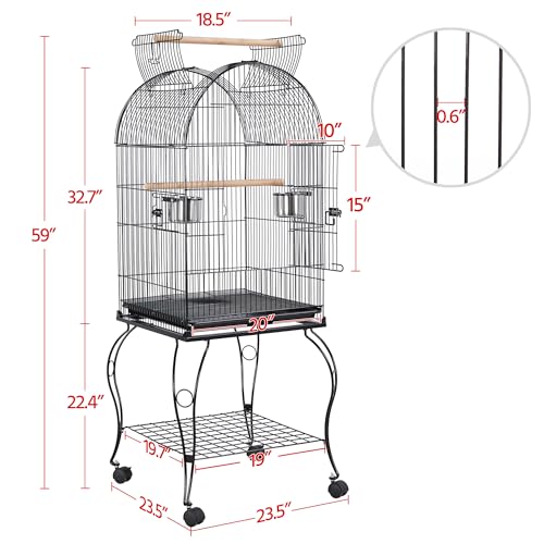 Perfect for small birds: This cage measures 51cm/20inch long, 51cm/20inch wide and 83cm/32.7inch high and with 1.5cm/0.6inch bar spacing. The decent size of this cage provides plenty of living space and room for activity to small birds like canary, cockatiel, lovebirds, etc