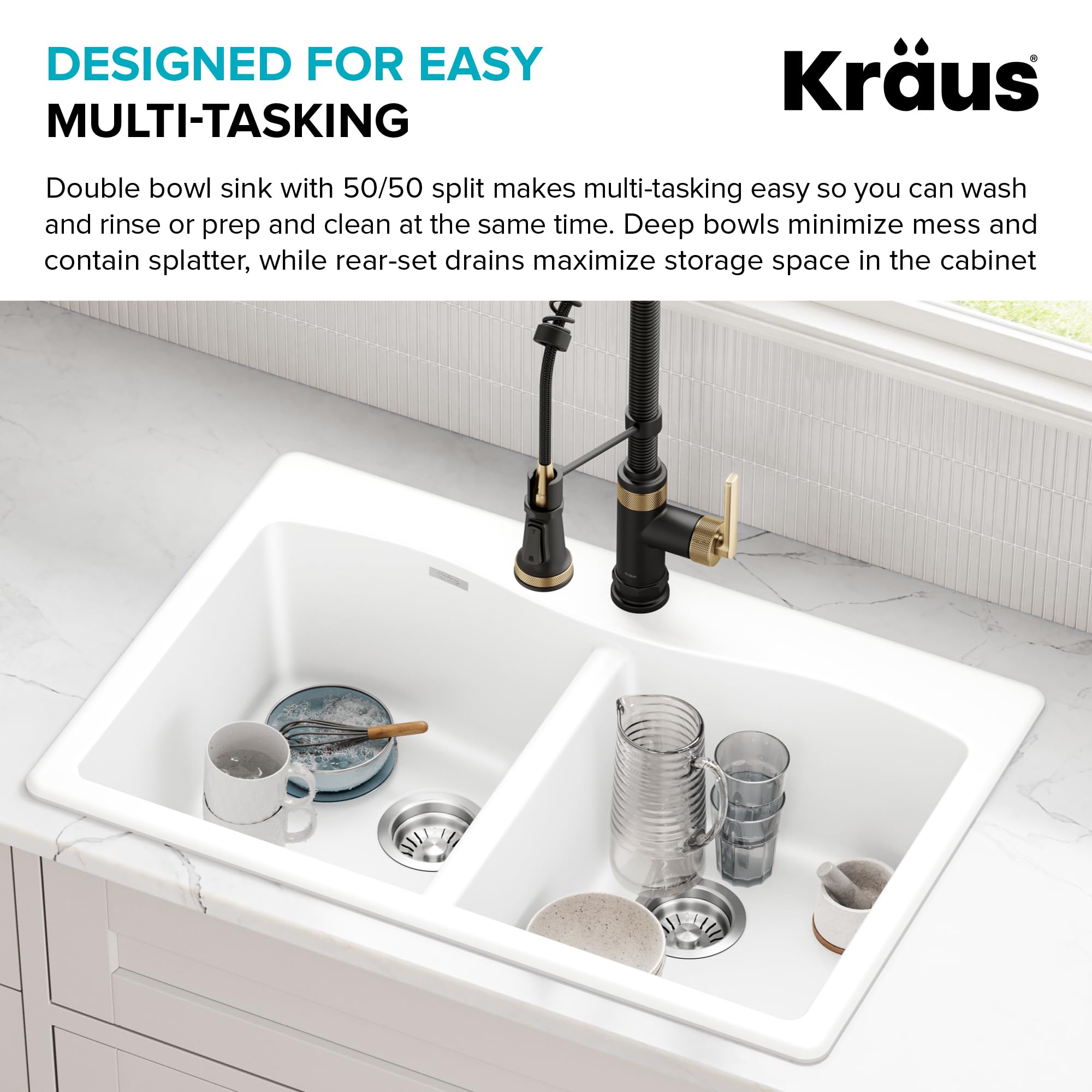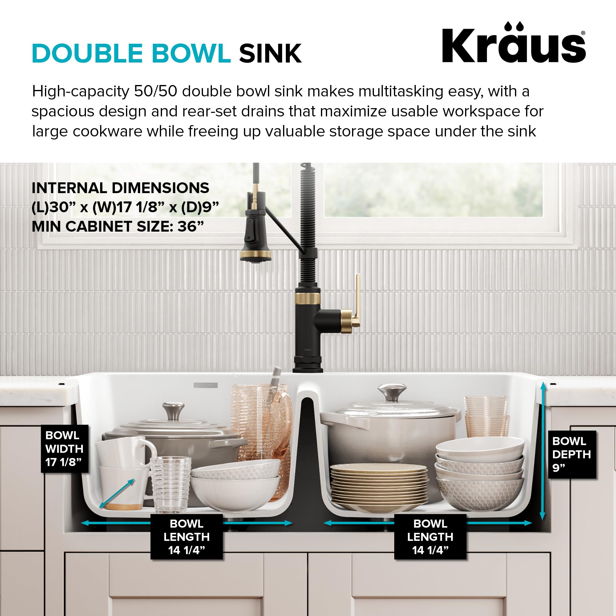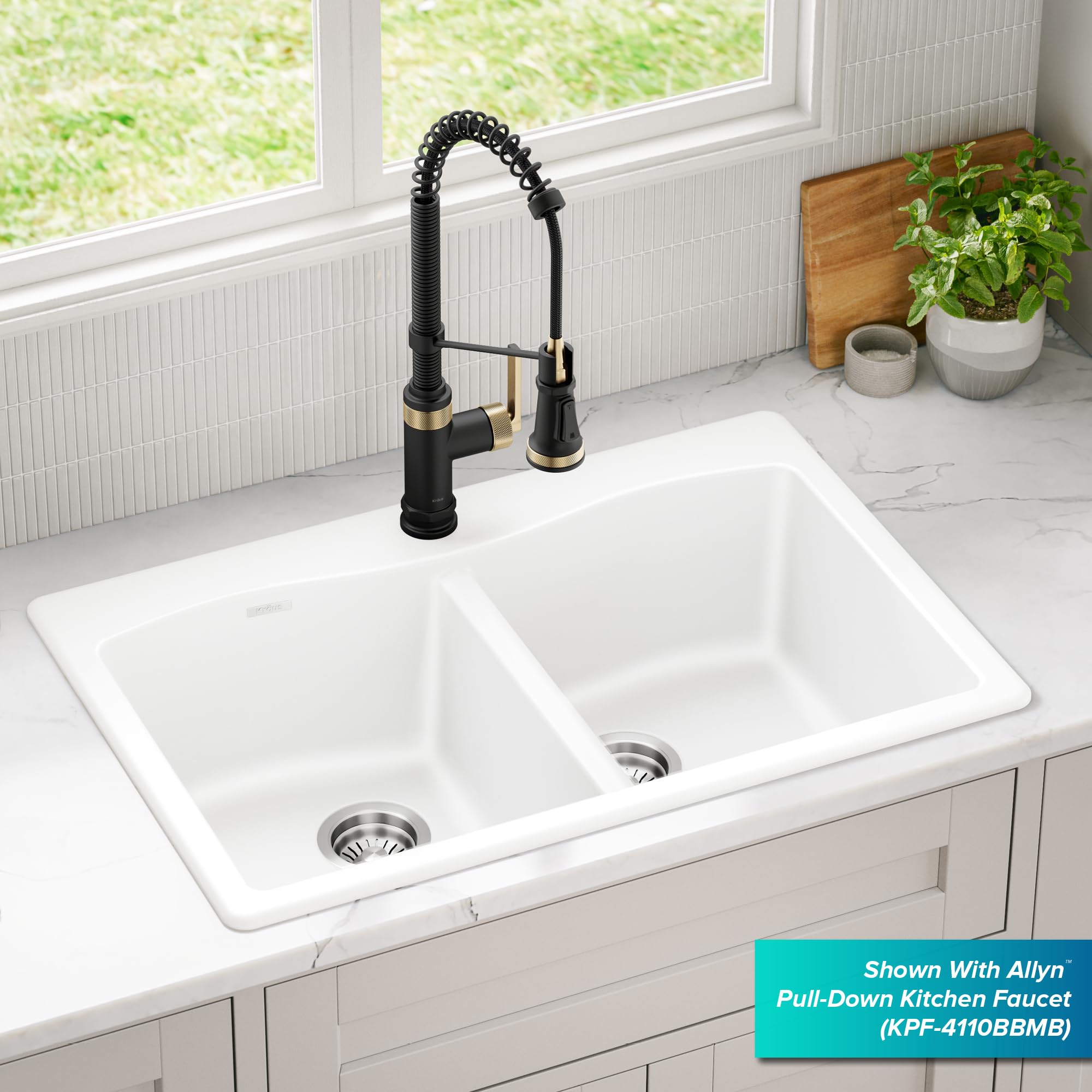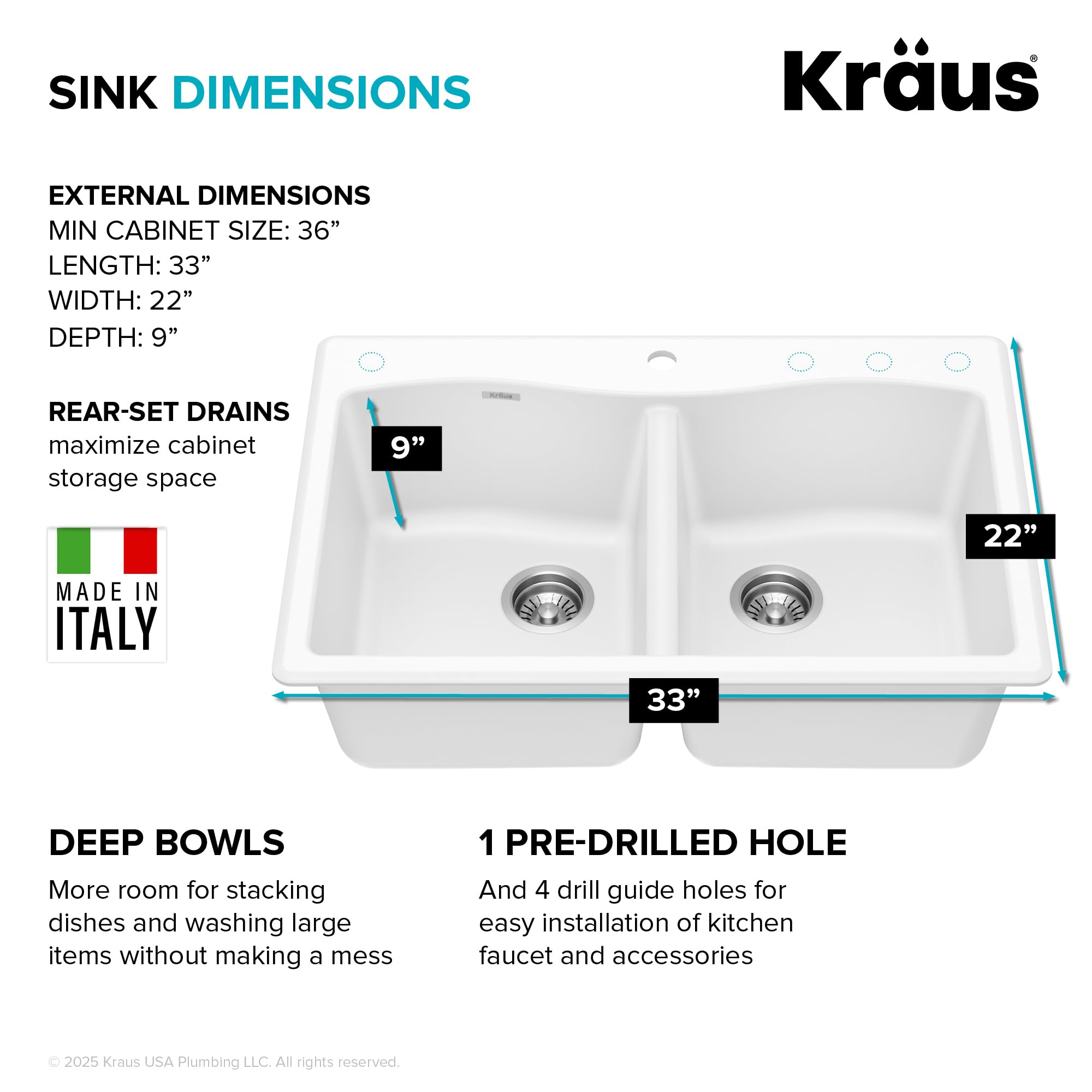 WHITE GRANITE SINK offers a clean, bright aesthetic and pairs beautifully with trending gold faucet or black faucet finish; Dims: 33 in L x 22 in W x 9 3/4 in D; Bowl dims (both bowls): 14 1/4 in L x 17 1/8 in W x 9 in D; Min cabinet size: 36 in