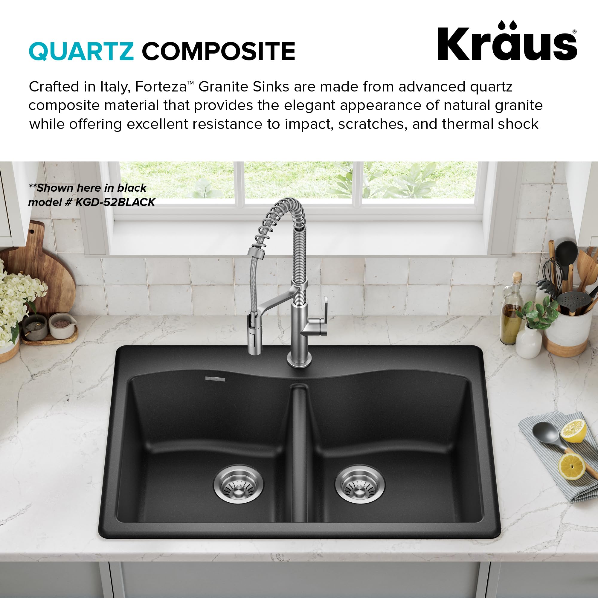 Forteza granite kitchen sinks are made from premium quartz composite material with the elegant look of natural granite, with rounded corners and smooth easy-to-clean surface. White kitchen sink offers a clean, bright aesthetic that works with any style of kitchen and pairs beautifully with trending matte black faucet finish. Dual mount sink for kitchen design allows you to install this Forteza sink as an undermount sink or drop in sink with any kind of countertop material, with thick mounting deck for a finished look. Durable white sink stands up to impact, scratches, shock, and is colored all the way through to resist fading. Deep sink bowl with sloped bottom for easy draining has ample space for large items. Installation-ready white granite sink comes with drain and hardware.