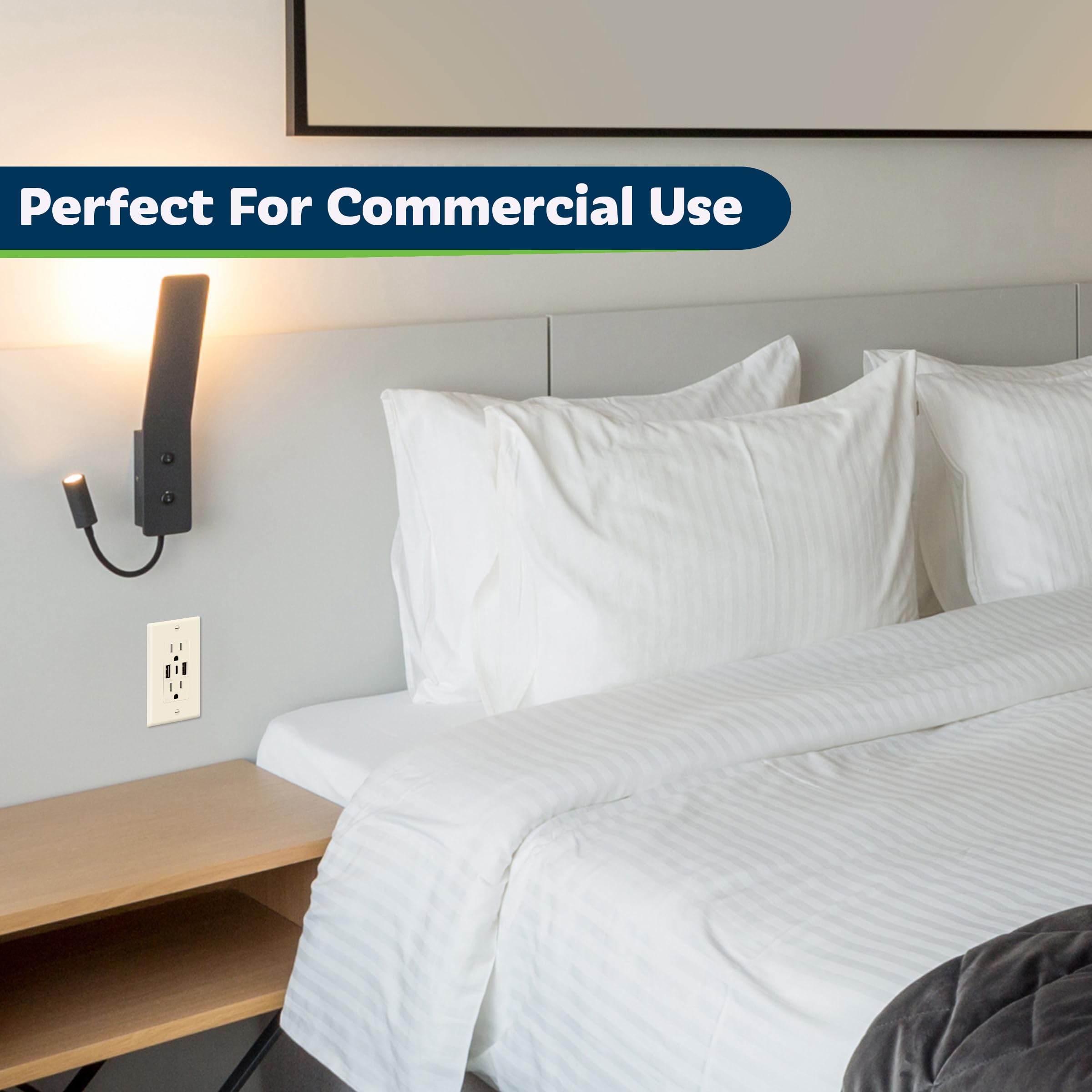 Light Almond color; maximum total output of 5V/3.6A; 15A, 125VAC; clamp-type wire terminals for easy installation; UL listed; 1-year warranty; two 1-gang standard decorator wall plates included.