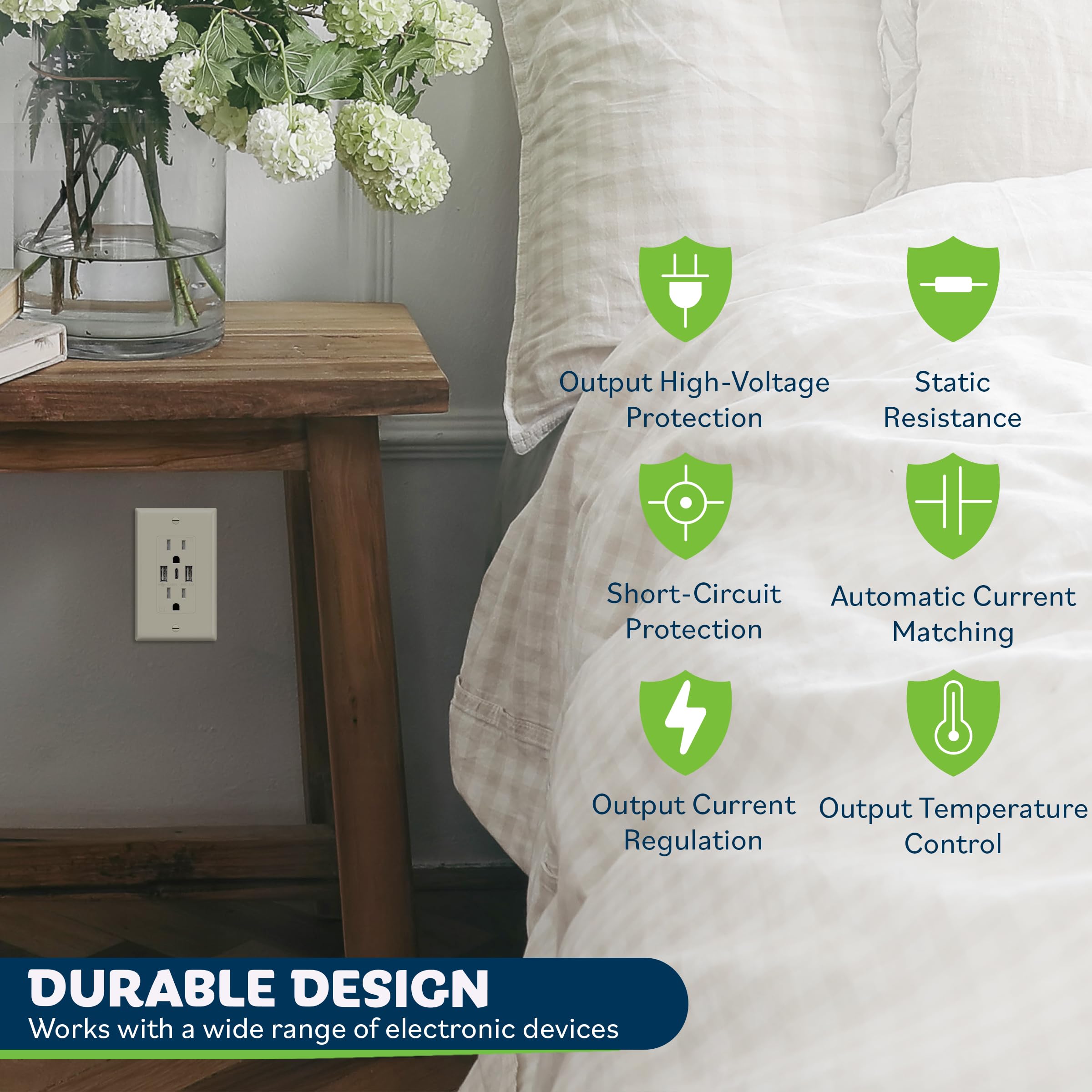 Allows you to charge USB devices while leaving room for other appliances; charge up to three USB devices simultaneously without adapters; perfect for kitchen, bedroom, living room, and commercial locations