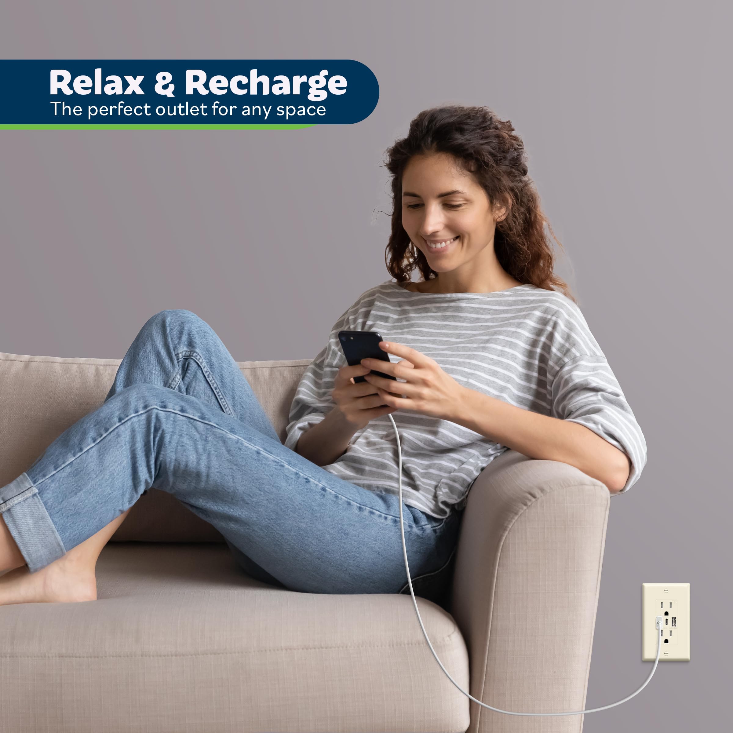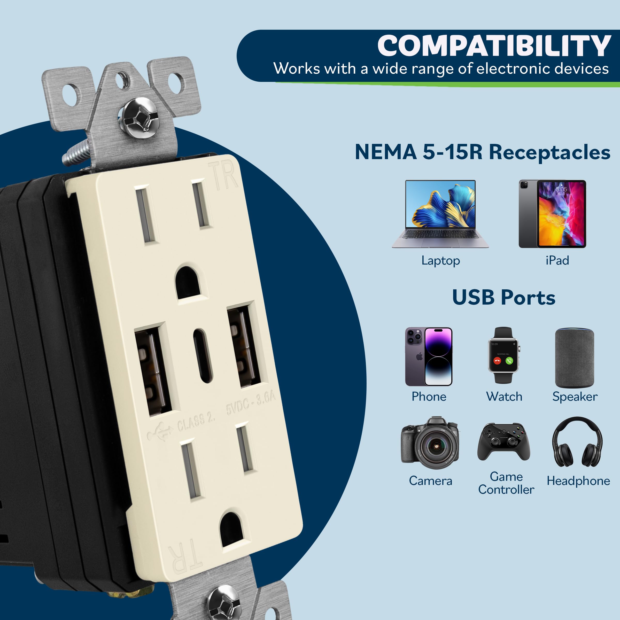 In-wall 3-port USB charging outlet with an output of 2.4A per USB-A port and 3A per USB-C port (for a total max output of 3.6A); includes 2x Type-A USB ports, 1x Type-C USB port, and 2x 15A tamper-resistant plug outlets; does not support fast charging technologies
