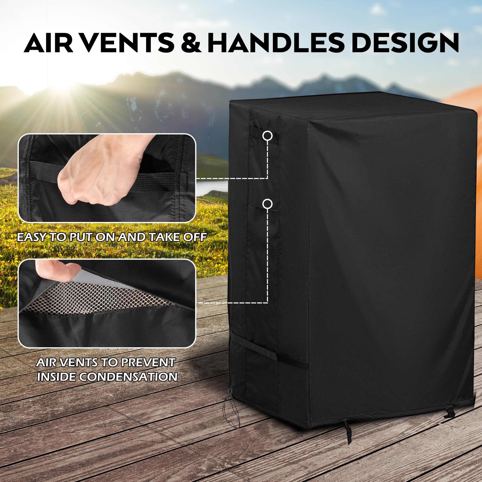 AIR VENT & HANDLES – The design of the air vents can improve the air flow to prevent inside condensation, keeping your outdoor smoker dry and clean. Two reinforced handles make the cover easy to put on and take off