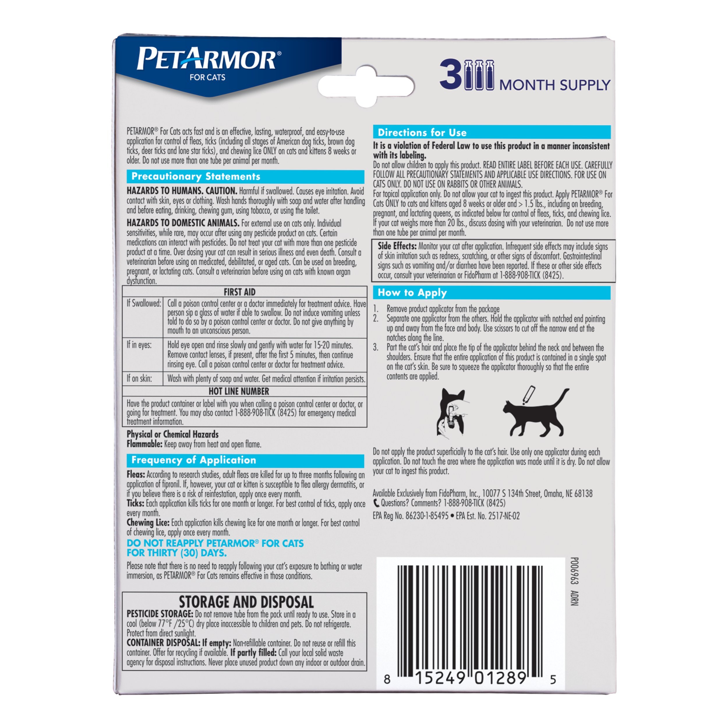 INCLUDES: Three (3) 0.017 fl. oz. waterproof topical applications for cat flea and tick control. For best results, apply flea and tick treatment for cats directly to dry skin on your cats back, between the shoulder blades, on a monthly basis.