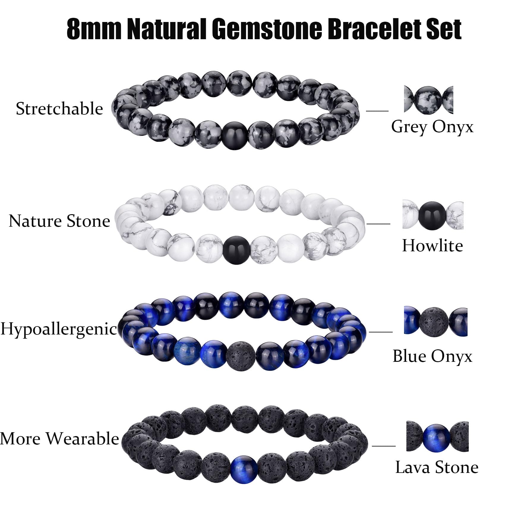 Mens Bracelets Size:The tiger eye stone and black matte agate stone bracelet can Stretch,Bead size:8mm,Adjustable Range: 7.3''-10.4''. Perfect sizes as gemstone bracelet for both men and women UNISEX. Natural tiger eye mens bracelet is a perfect bracelet jewelry accessory for any occasion to change your style and mood.