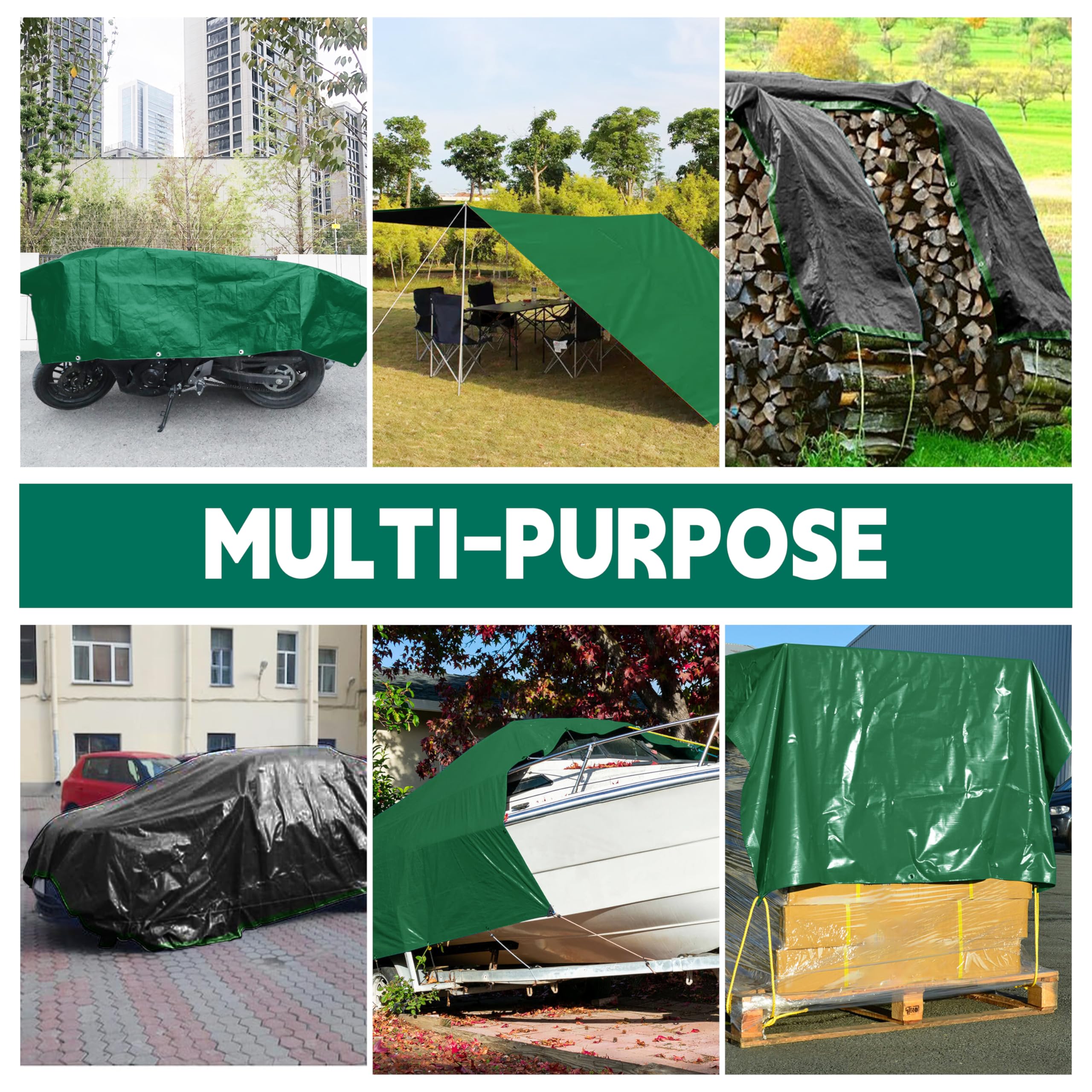 Multipurpose:Our waterproof tarp can be used to cover a variety of items such as outdoor furniture, vehicles, roofs, boats, swimming pools, camping tarps, camping mats, and more, providing comprehensive protection and convenience.