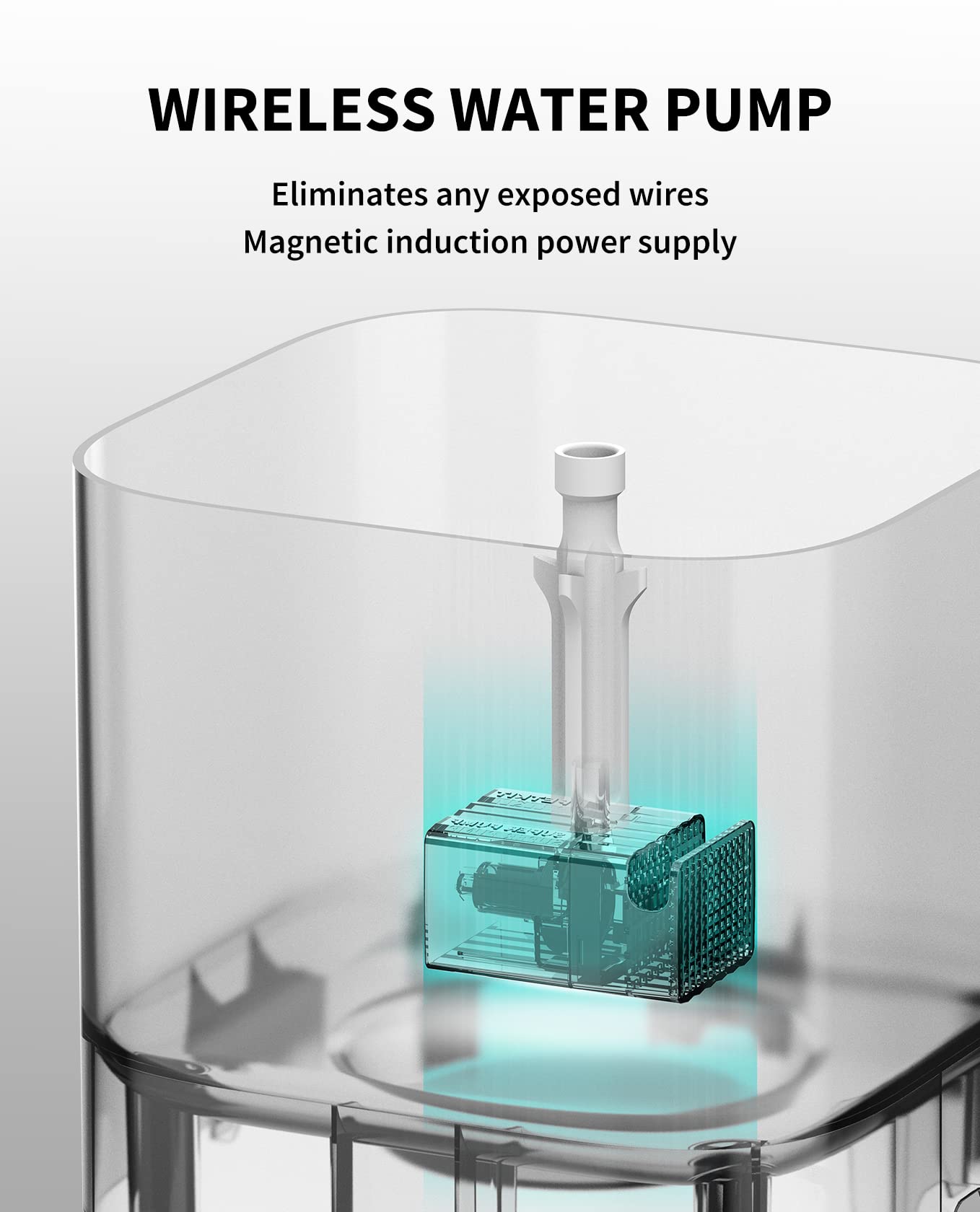 3.0 WIRELESS PUMP: This automatic cat water fountain uses upgraded wireless pump 3.0, which is more stable than wired water pump and does not have any wire bundle entanglement, it is more safe. At the same time, a piece of foam filter is placed in water inlet of the pump, which can intercept impurities entering the pump in advance and make the pump have a longer service life. Removable pump structure also makes cleaning easy.