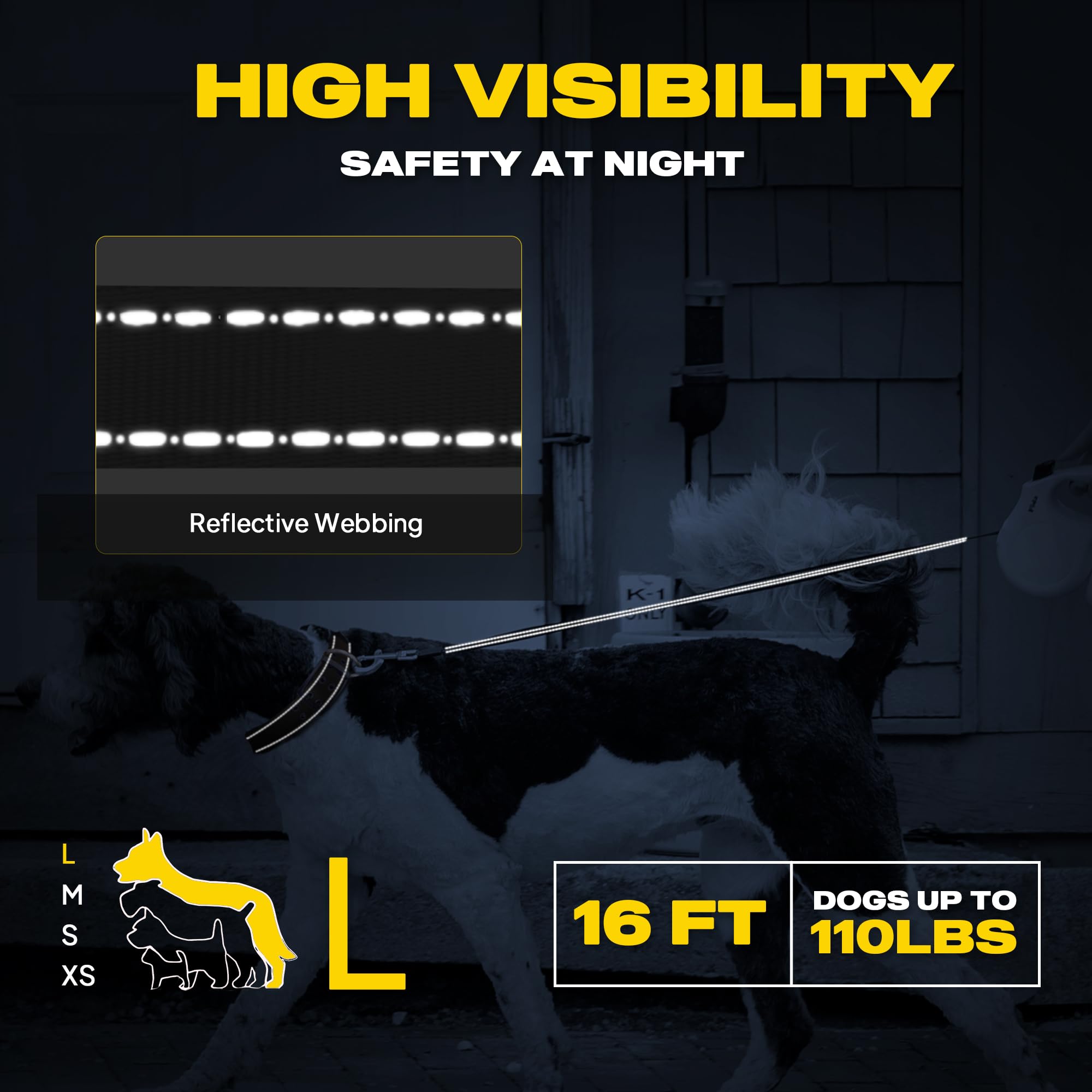 HEAVY DUTY, DURABLE & STEADY - 16 ft high strength nylon tape with durable rustproof swivel hook and steady impact-resistant ABS material, suitable for large dogs up to 110 lbs. Top durability Internal Coil Spring for Consistent Retraction several years.