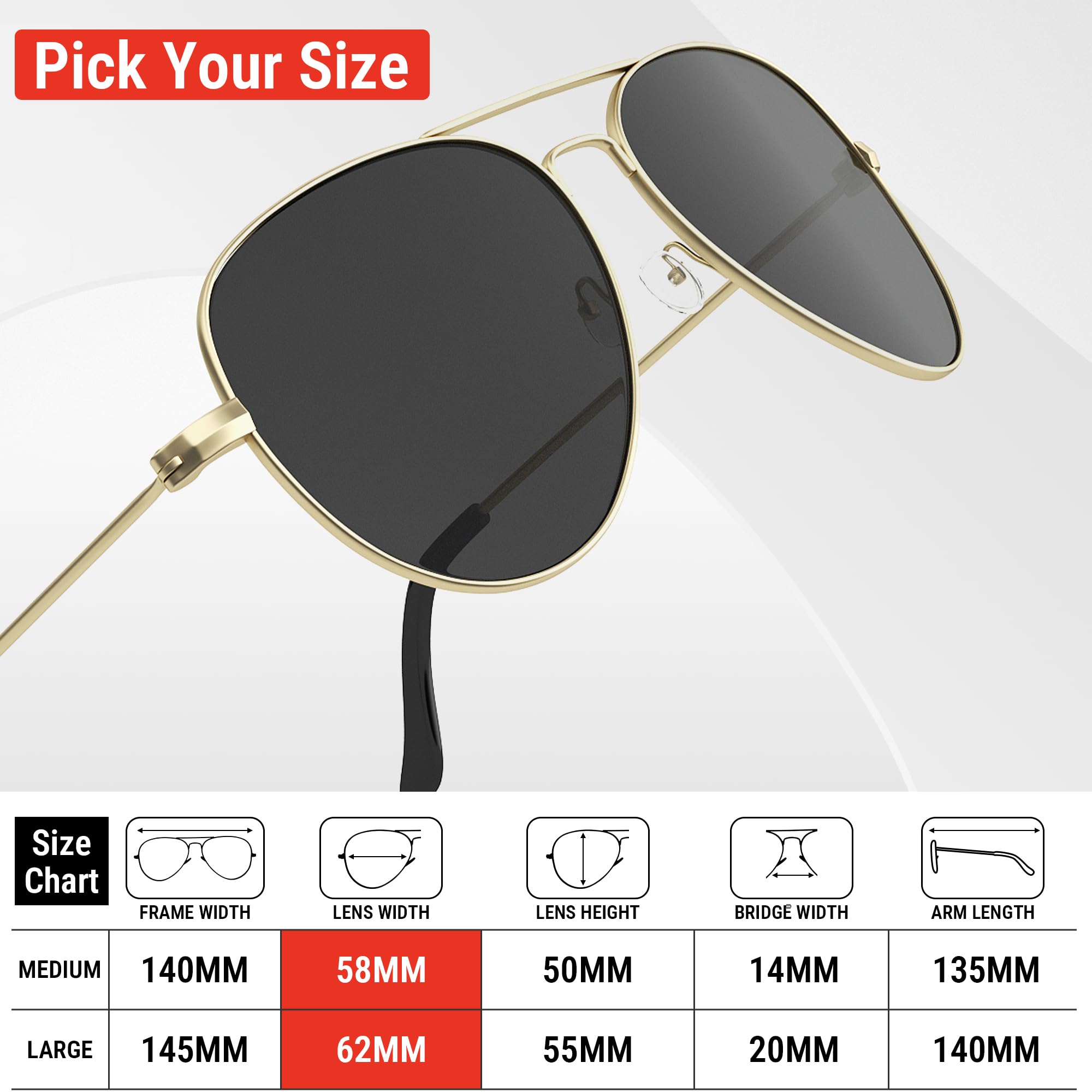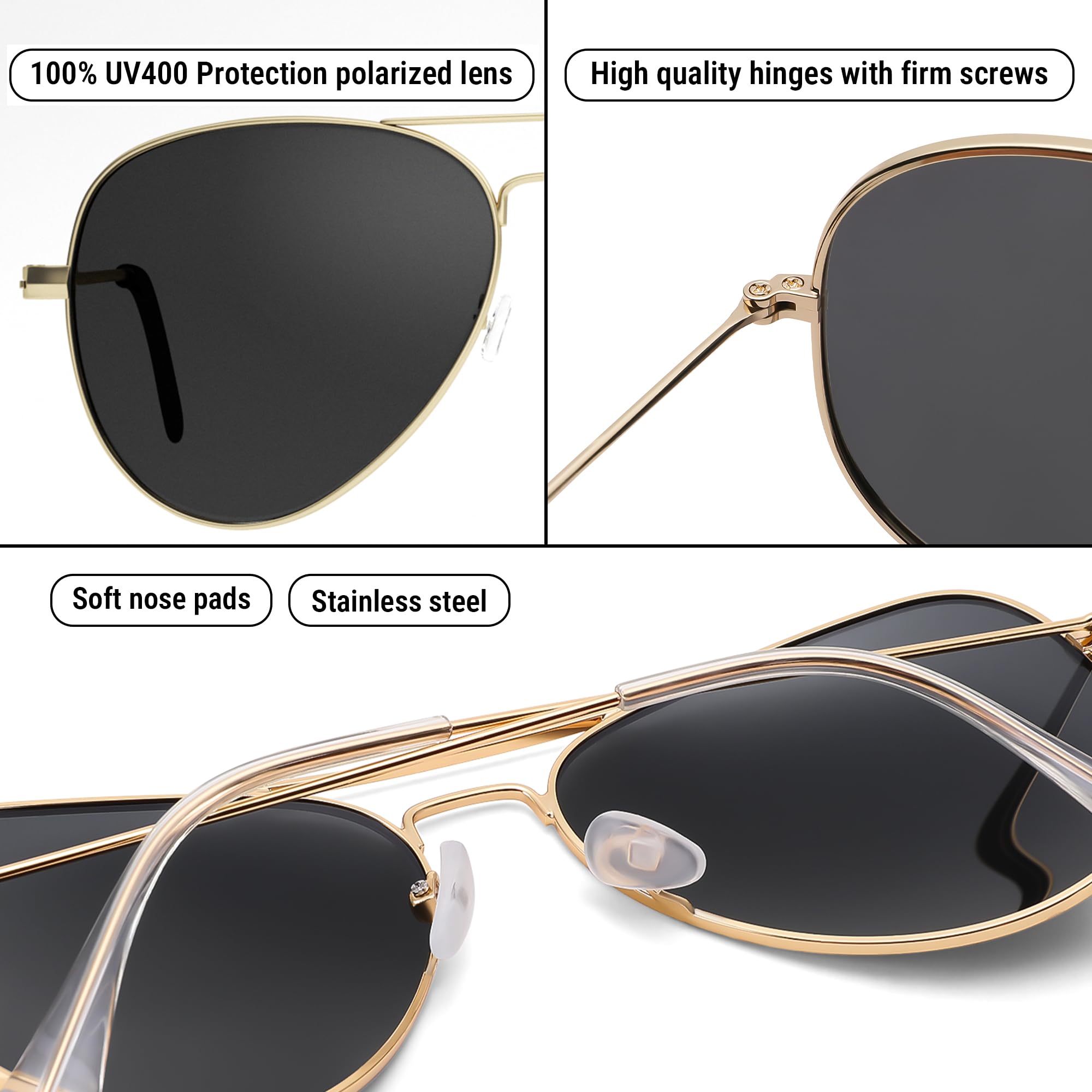 Polarized Protection: During outdoor activities, high-quality polarized glasses provide 99.9% UV400 protection and efficiently decrease glare. The classic aviator sunglasses are suitable for driving, cycling, fishing, and outdoor activities
