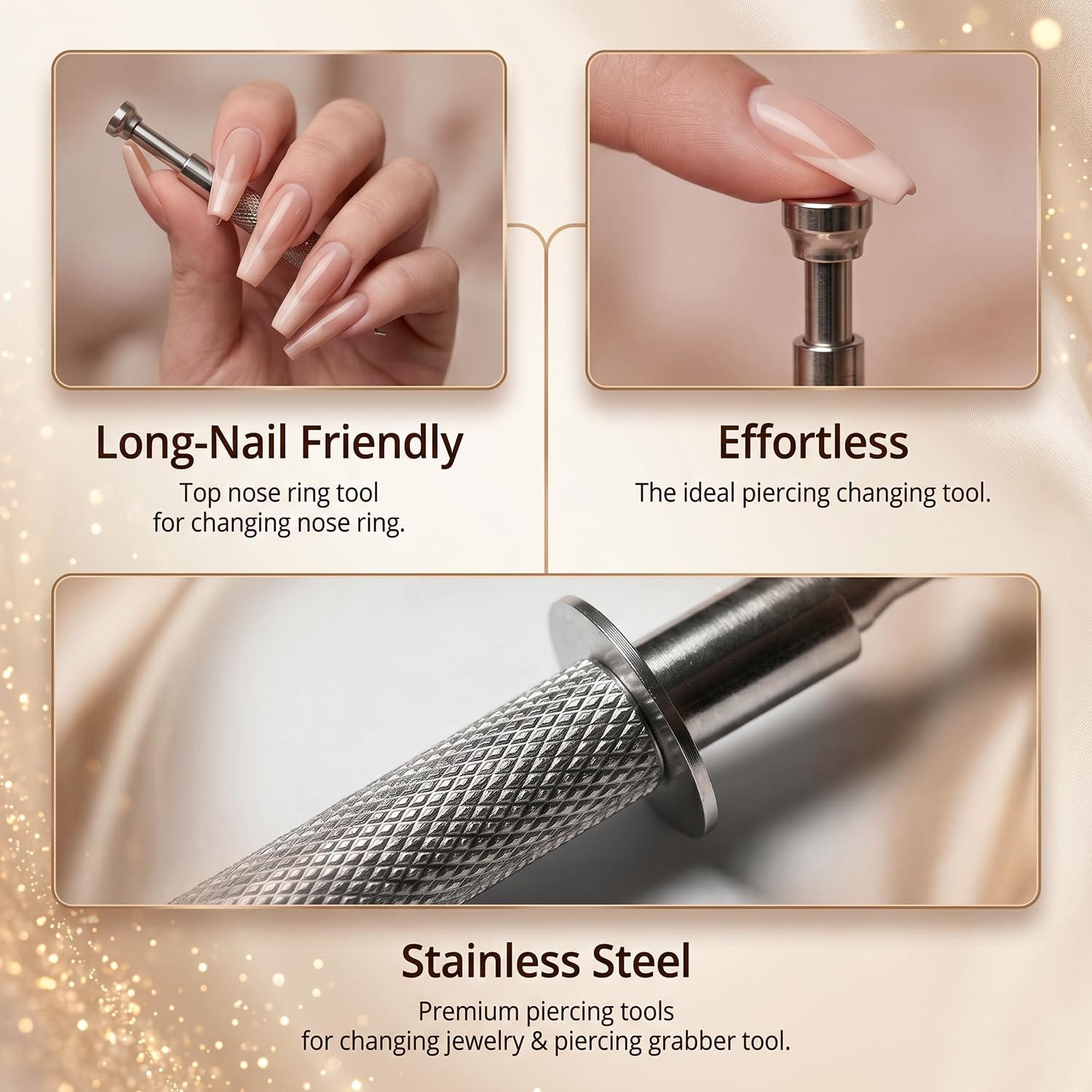 Advantage - This stainless steel grabber tool helps you screw on or screw off the top jewelry of the piercing jewelry, very friendly for people with long nails who cannot remove jewelry accessories.