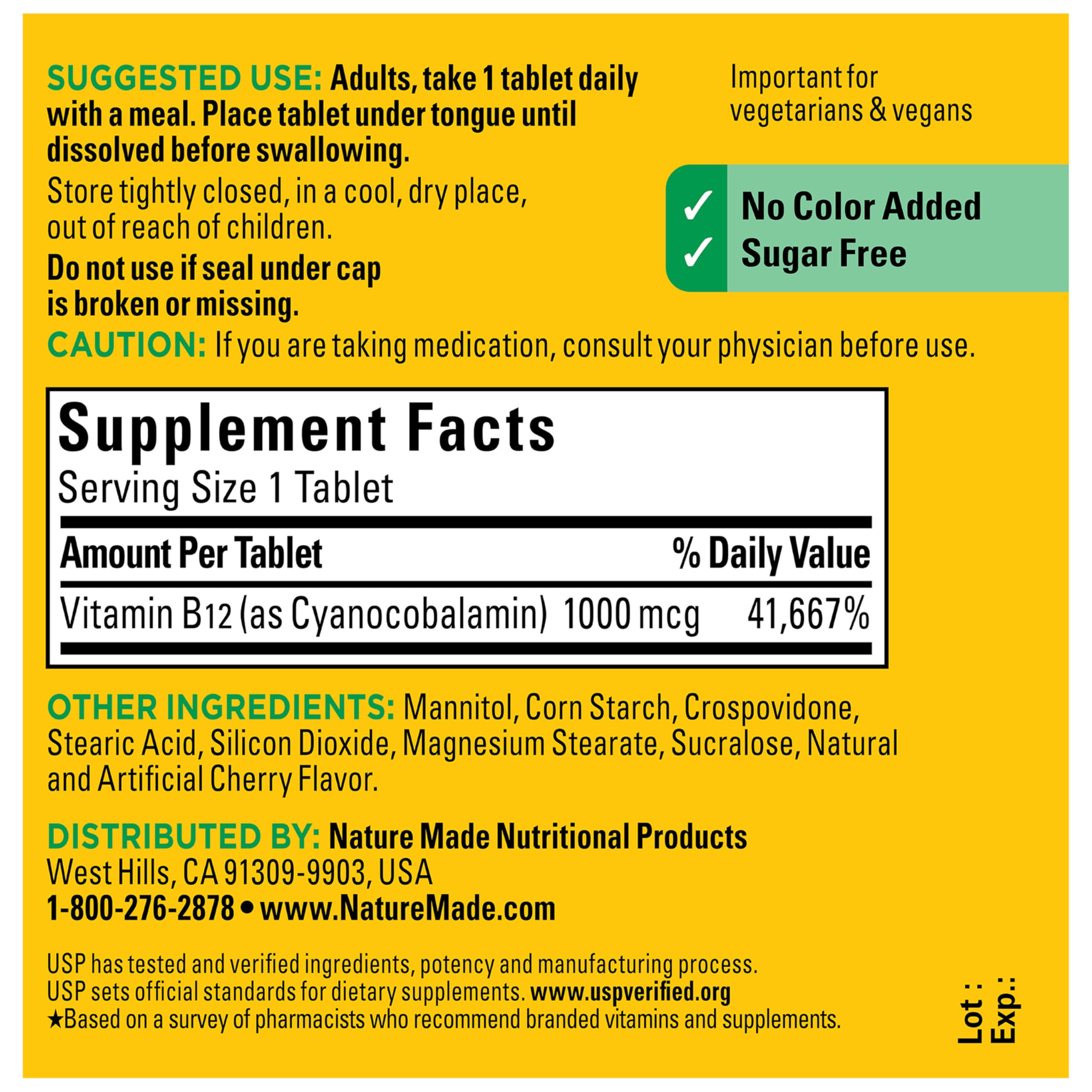 These Nature Made B12 vitamins 1000 mcg fast-dissolve tablets help break down food into energy your body can use all day long. This vit B12 sublingual tablet, sourced from high-quality global ingredients, is sugar free and has no color added. This B12 vitamin is a dietary supplement that is sugar free and has no color added. This daily dietary supplement is designed for adults to take by mouth by placing the tablet under the tongue, where it dissolves before swallowing—no water needed. It’s convenient for use at home or on the go and fits easily into any supplement user’s routine. USP has tested and verified ingredients, potency and manufacturing process. USP sets official standards for dietary supplements. Visit the USP verified website for more information. (1)Helps convert food into cellular energy. (2)Adequate Vitamin B12 status helps support a healthy mood. *Based on a 2022 survey of pharmacists who recommend branded vitamins and supplements. These statements have not been evaluated by the Food and Drug Administration. This product is not intended to diagnose, treat, cure, or prevent any disease.