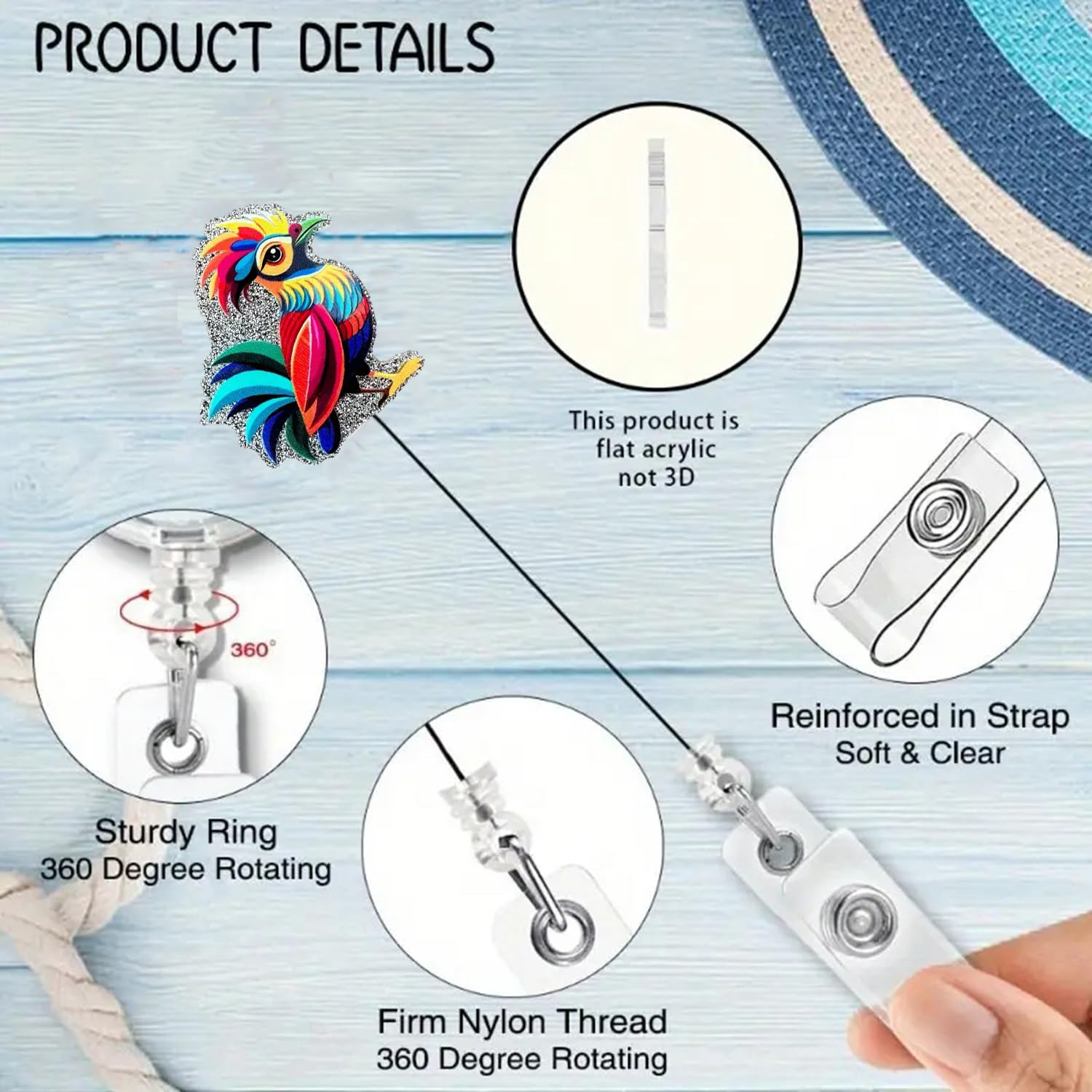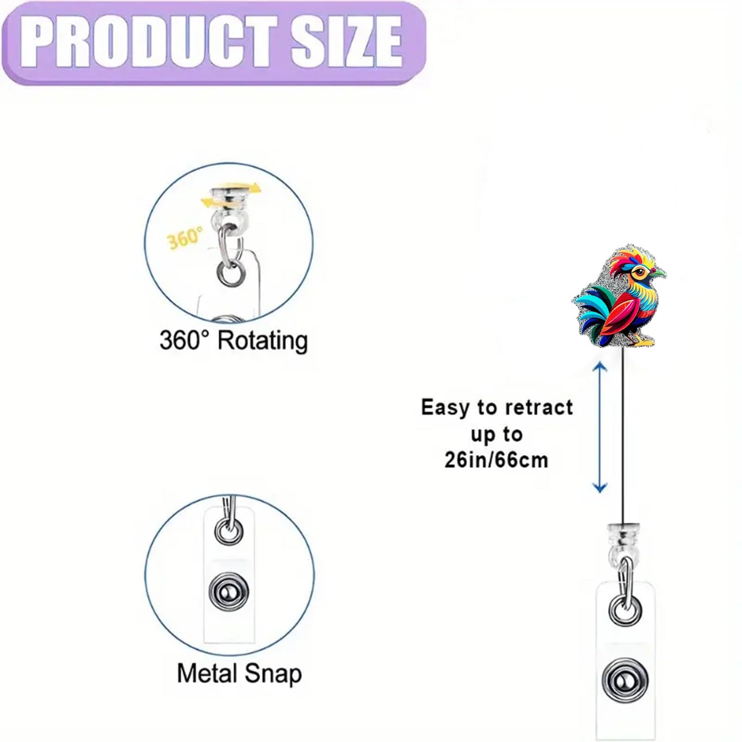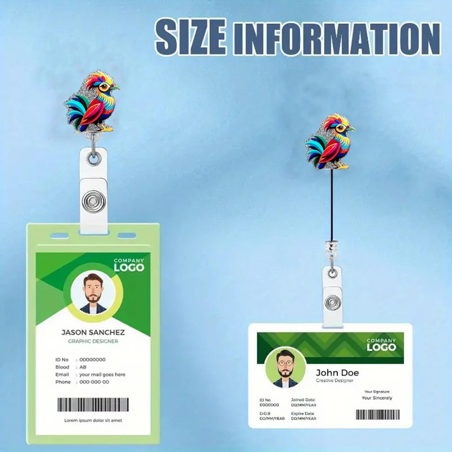 Badge Holder Specification: Colorful bird badge reel Diameter 1.77 inches (4.5cm), retract extension 25.5in(65cm) nylon rope. Sturdy alligator clip never drops off your ID badge