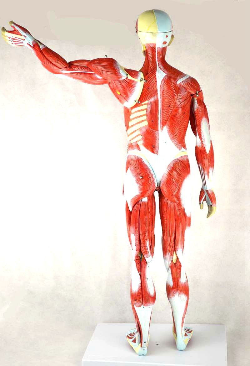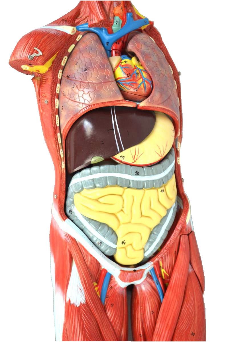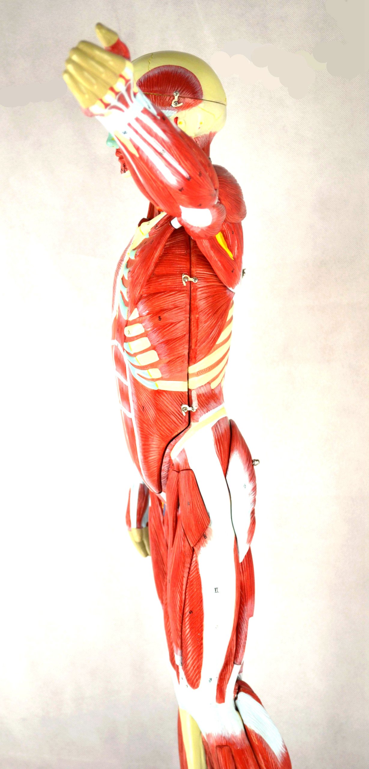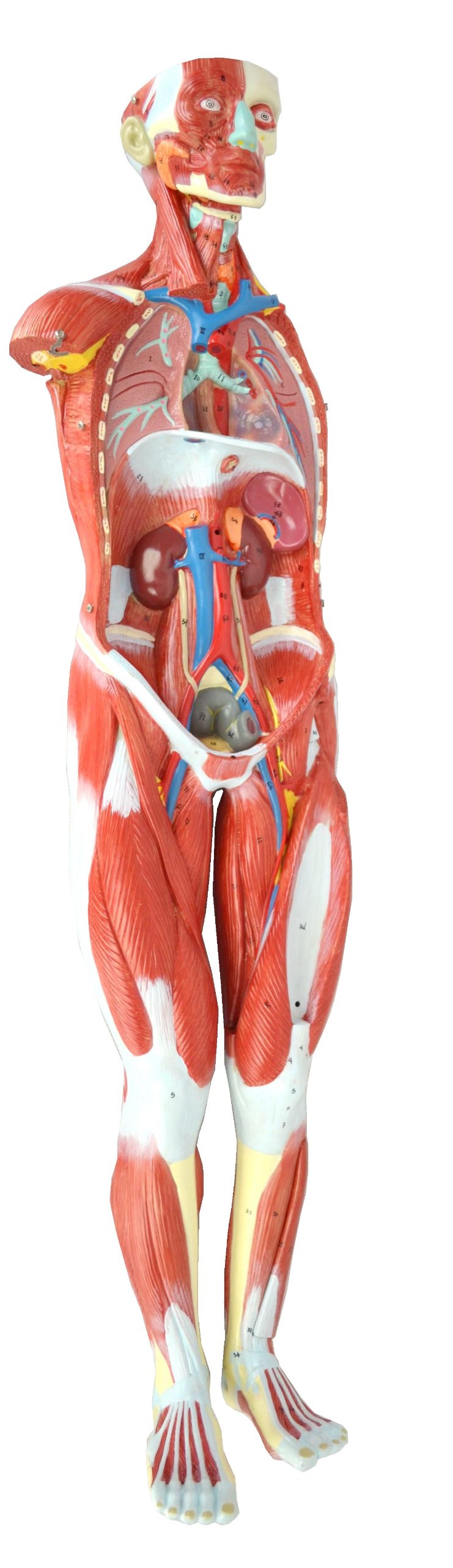 This model is ½ natural size, in high quality PVC and non-toxic paint, this model represents complete human muscular and organs anatomy. It is an excellent tool to demonstrate and learn the details of the superficial and deeper muscles, tendons, vasculature, ligaments, vessels and body structures. The model can be disassembled into 27 parts: Cranium; brain (2); thoracic and abdominal wall; lung (2); heart (2); liver; stomach; duodenum; small and large intestine; right arm; left arm with 4 removable muscles; muscles of the leg (9); figure. More than 100 numbered structures for accurate identification. Numbered guide is included. Height: 80cm Width: 49cm Weight: 7kg Mounted on base (33x23x3cm)