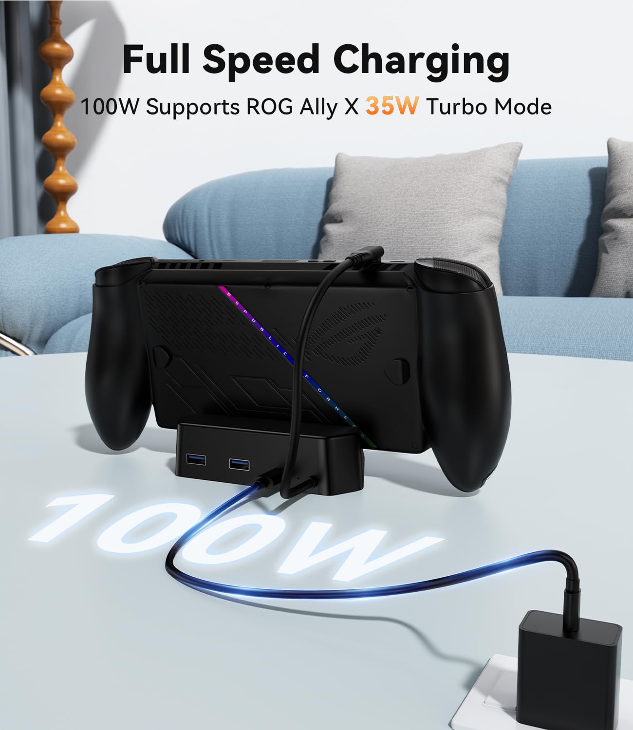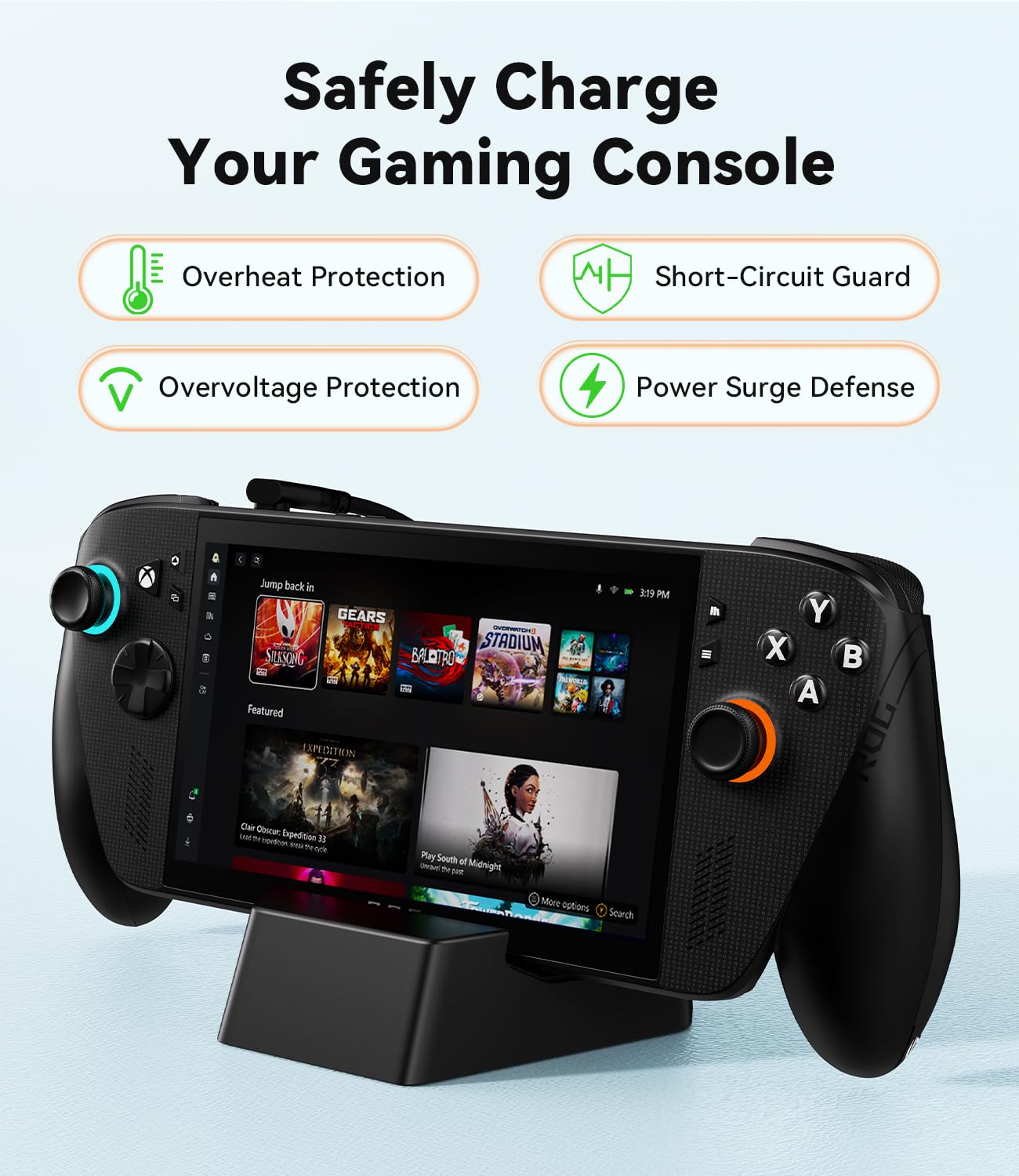Safe Charging Protection: This charging stand is designed with over-current and over-voltage protection, ensuring the safety of your ROG Xbox Ally during charging. It is designed for use only as a charging stand and cannot be connected to a TV.