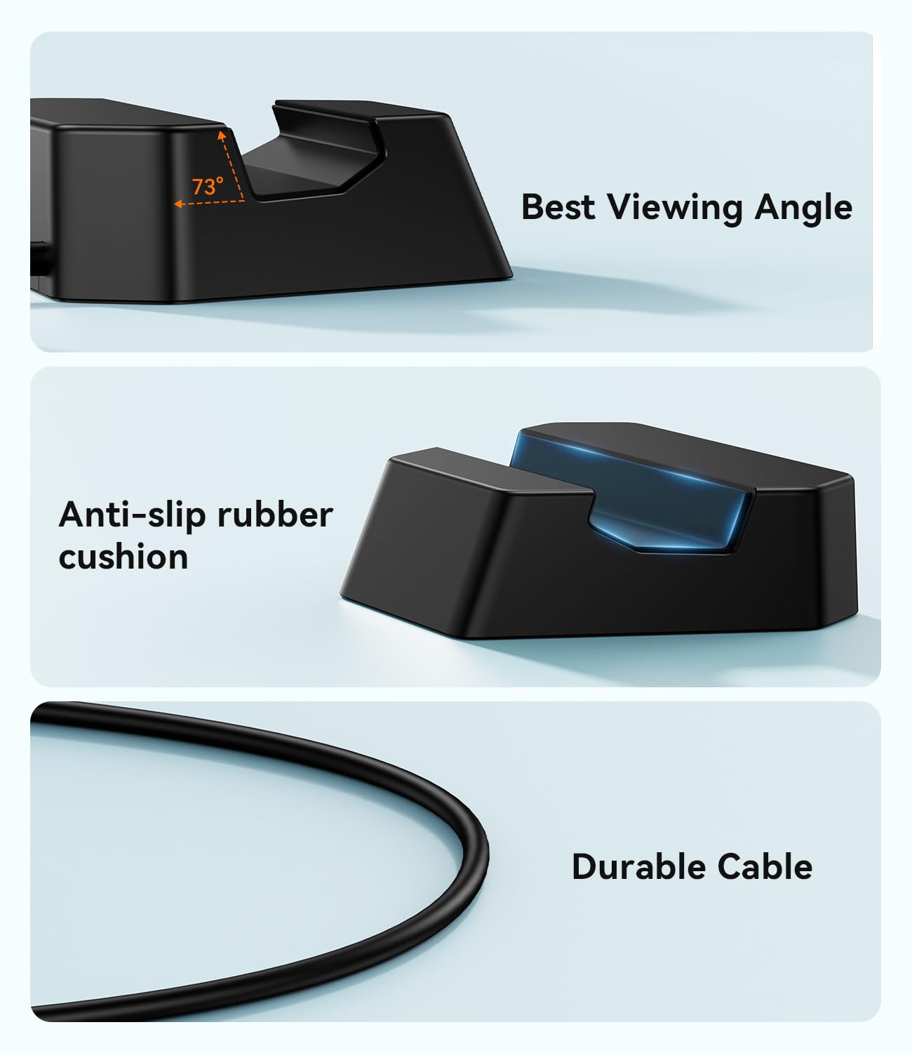Improved Experience and Stability:This charging stand features a comfortable 45° elevation angle that offers an optimal viewing experience while playing your favorite games. The non-slip rubber pad at the bottom ensures improved stability for your game console when standing, while the soft silicone pad on the ventral surface protects against scratches.