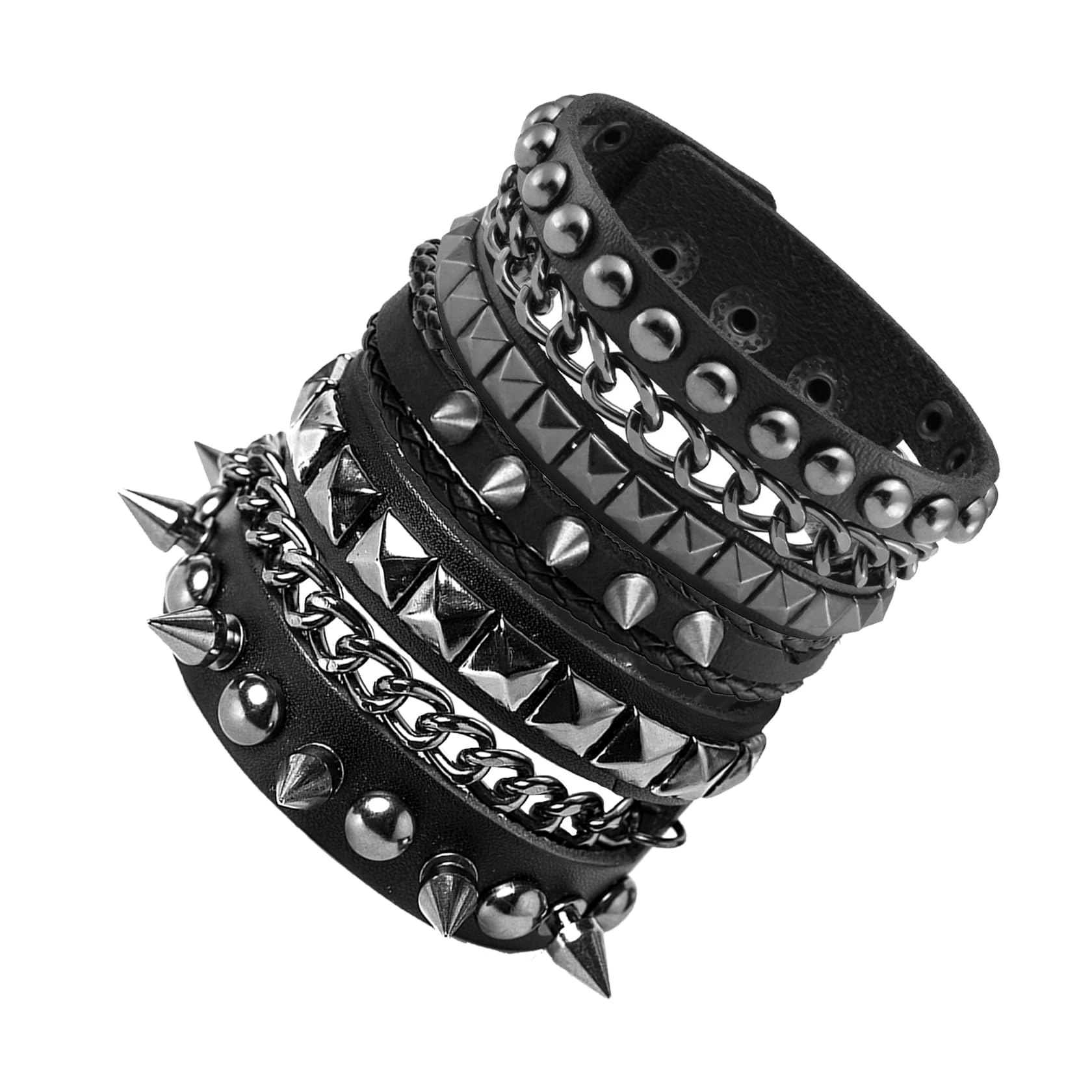 1. 3 Pcs Punk and Gothic Leather Bracelets you will get: A Cool Hollow Bracelet with Chain and Spikes + A Cool Hollow Bracelet with Chain and Rivet + An Attractive Punk Leather Bracelet with little Spkes