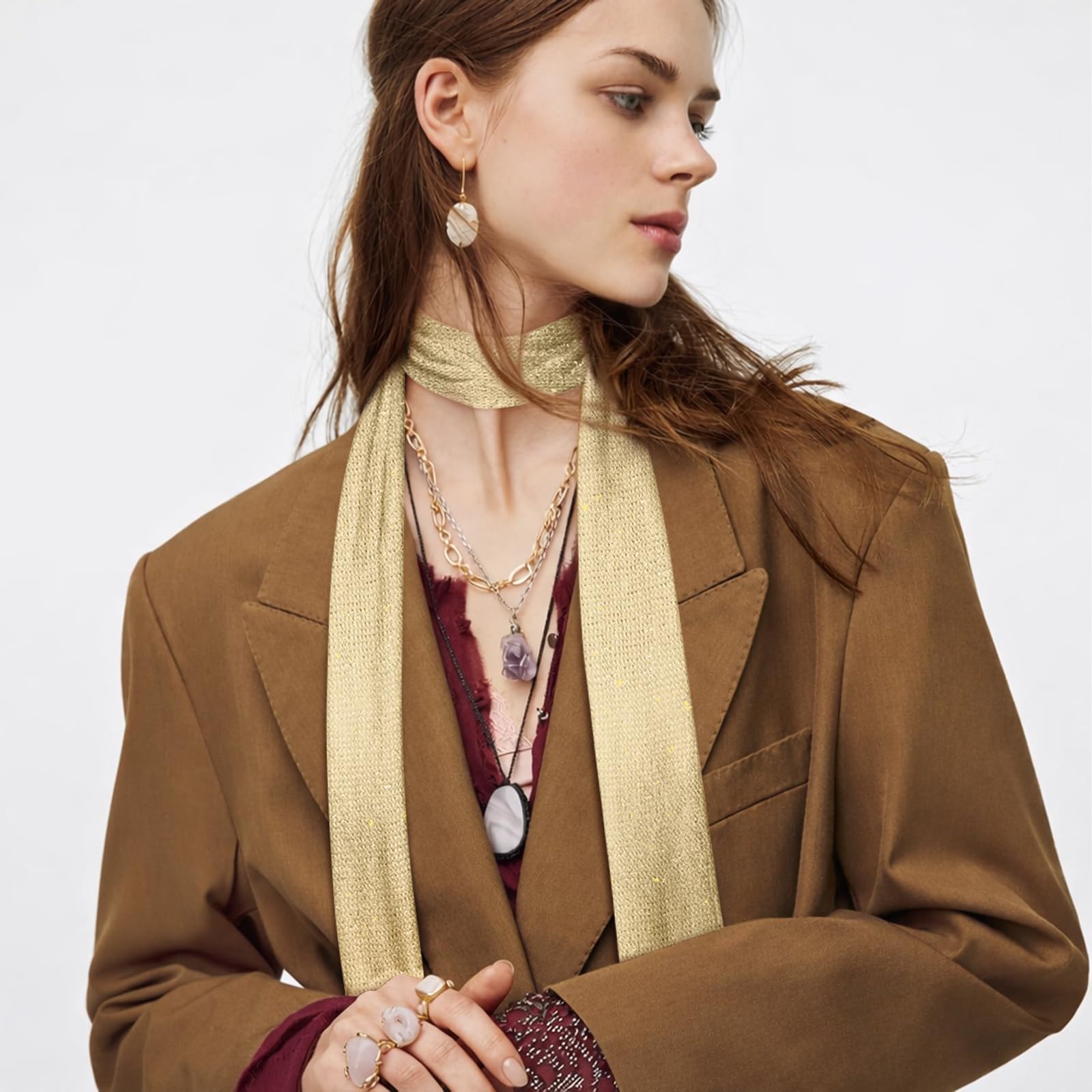Woven from polyester silk and gold thread, this gold scarf feels breathable, soft, and strong. A perfect choice among scarves for women lightweight for layering or everyday wear