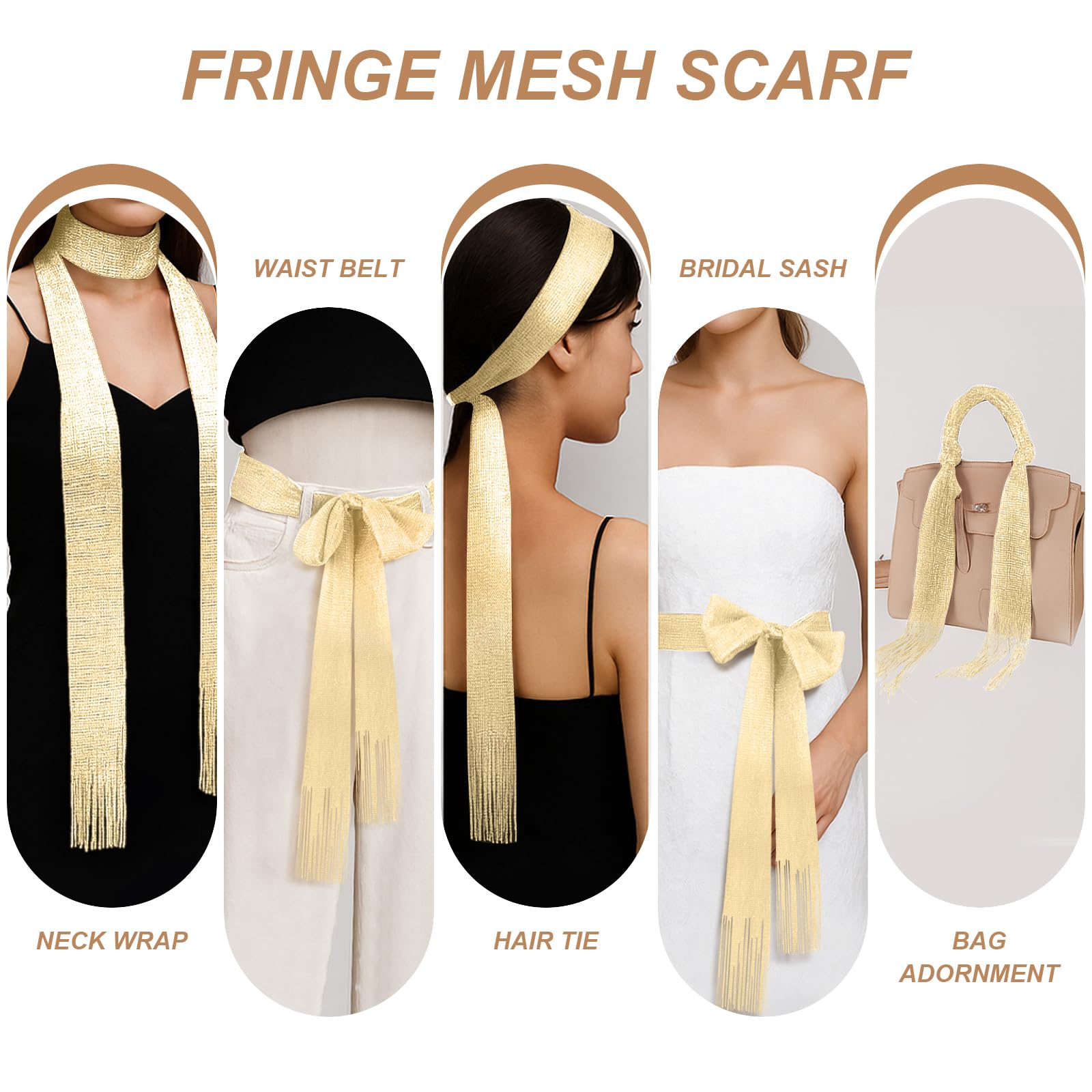 Description This fringe mesh wrap is the ultimate all-in-one accessory, effortlessly transforming into a waist belt, skirt belt, long head scarf, handbag ribbon, or trendy decorative belt. Whether you're going for a coachella head scarf, a gold scarf belt, or a retro 70s-inspired look, this piece adapts to your personal style and vibe. With a generous 78.7-inch length, it wraps comfortably around all body types—from petite to plus size. It works beautifully as a cowgirl belt, western belt for dresses, or a hip belt for women looking to add flair to jeans, skirts, or summer outfits. Crafted from lightweight polyester silk and metallic gold thread, this breathable mesh wrap feels soft against the skin while offering just the right touch of shimmer. Its airy texture makes it ideal for both everyday wear and layering on special occasions. Inspired by Y2K, boho, and western fashion, it pairs seamlessly with cowboy belts, concho belts, or a classic women’s western belt. Whether you're dressing up for a festival, beach party, concert, or casual day out, it elevates your look with effortless charm. Lightweight, versatile, and easy to pack, this is a thoughtful gift for fashion lovers who collect scarves for women, enjoy trendy belts, or want a country-inspired accessory with modern appeal.
