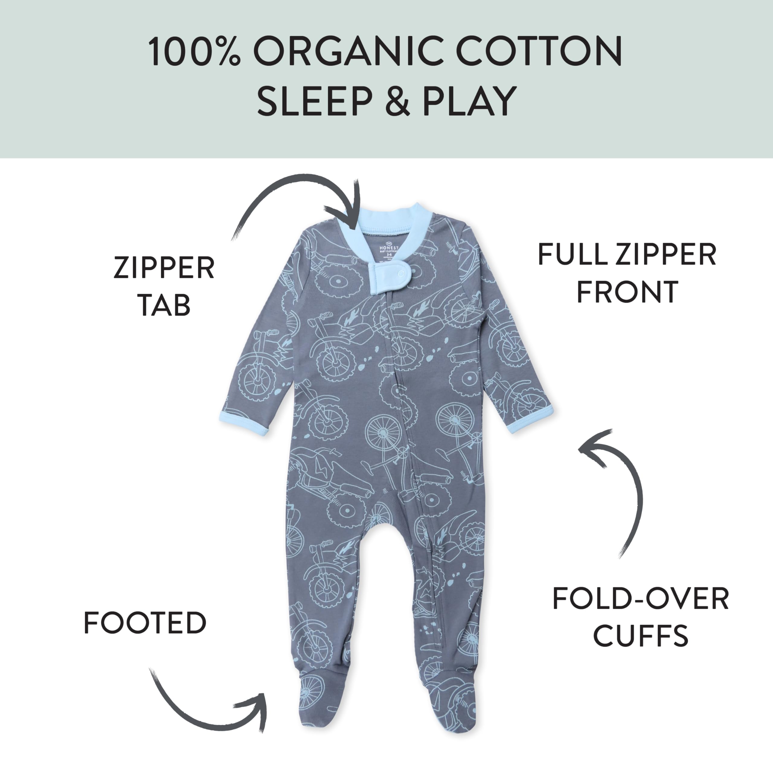Description Our sleep & play lives up to its name! This adorable footed sleeper keeps up with baby all day and all night. Friendly features include a zipper front with a tab to protect little chins and fold-over cuffs on the smaller sizes. The full-open zipper makes it easy for those late night diaper changes. 100% soft organic cotton and playful prints make this the perfect one-piece for sleeping, playing, and everything that happens in between. You will want every one of these adorable prints! A registry must-have, this baby pajama makes the best gift for new moms and dads.