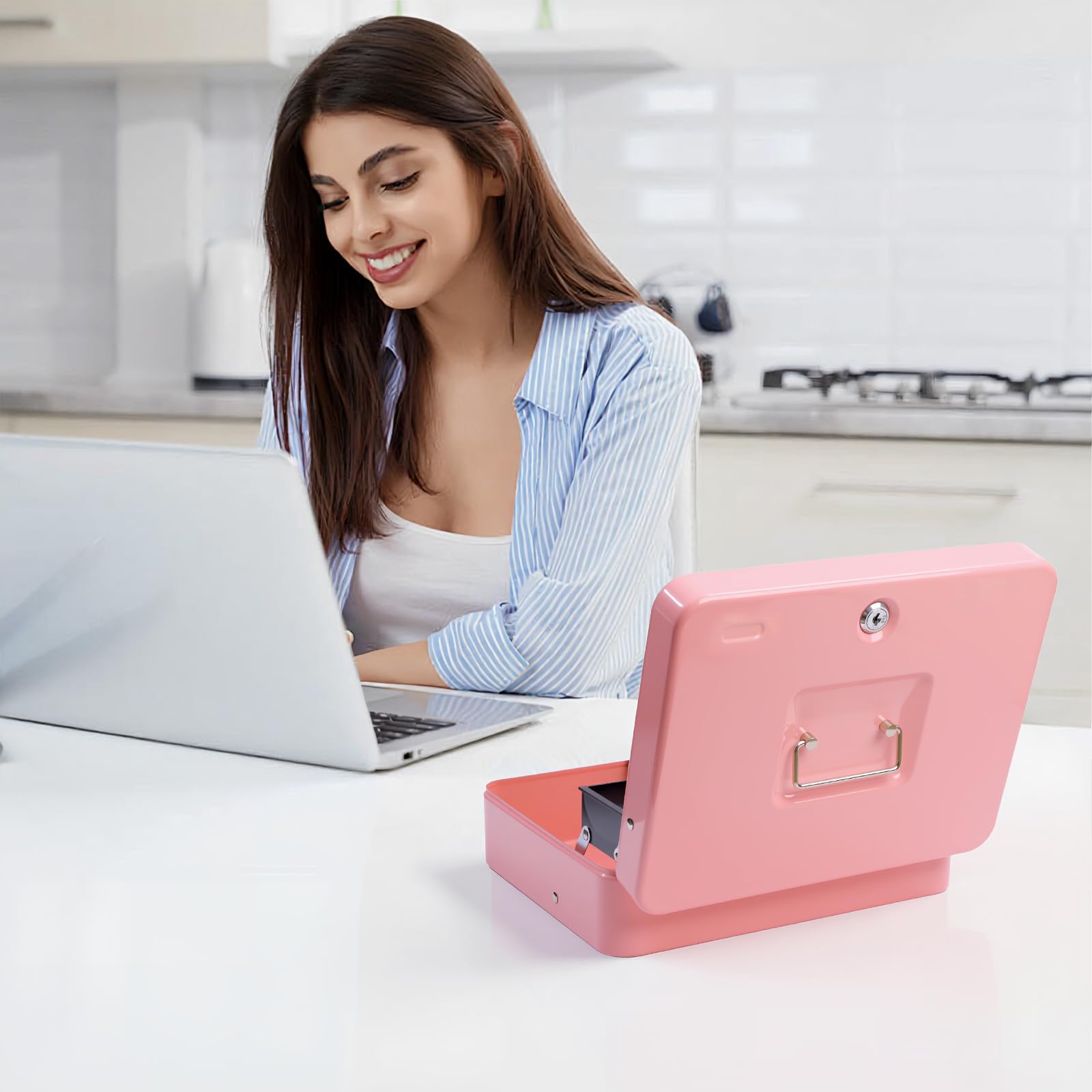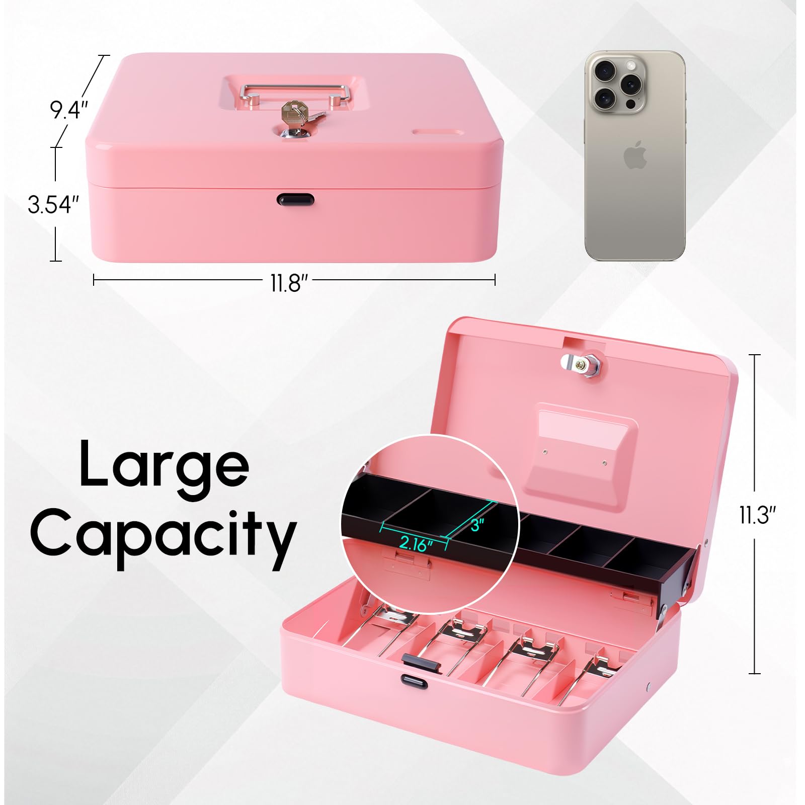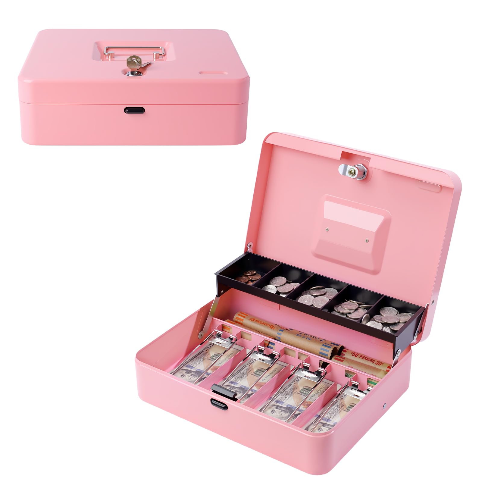 SECURE CASH BOX: Our cash box with money tray is designed with two tiers, the coin tray has five slots comes over the cash box when it's opened, below the coin tray is the cash storage area with four slots, along with extra space at the bottom for storing checks, receipts, coin rolls, etc. Making it a well designed lock box to keep your valuables safe and well organzied.