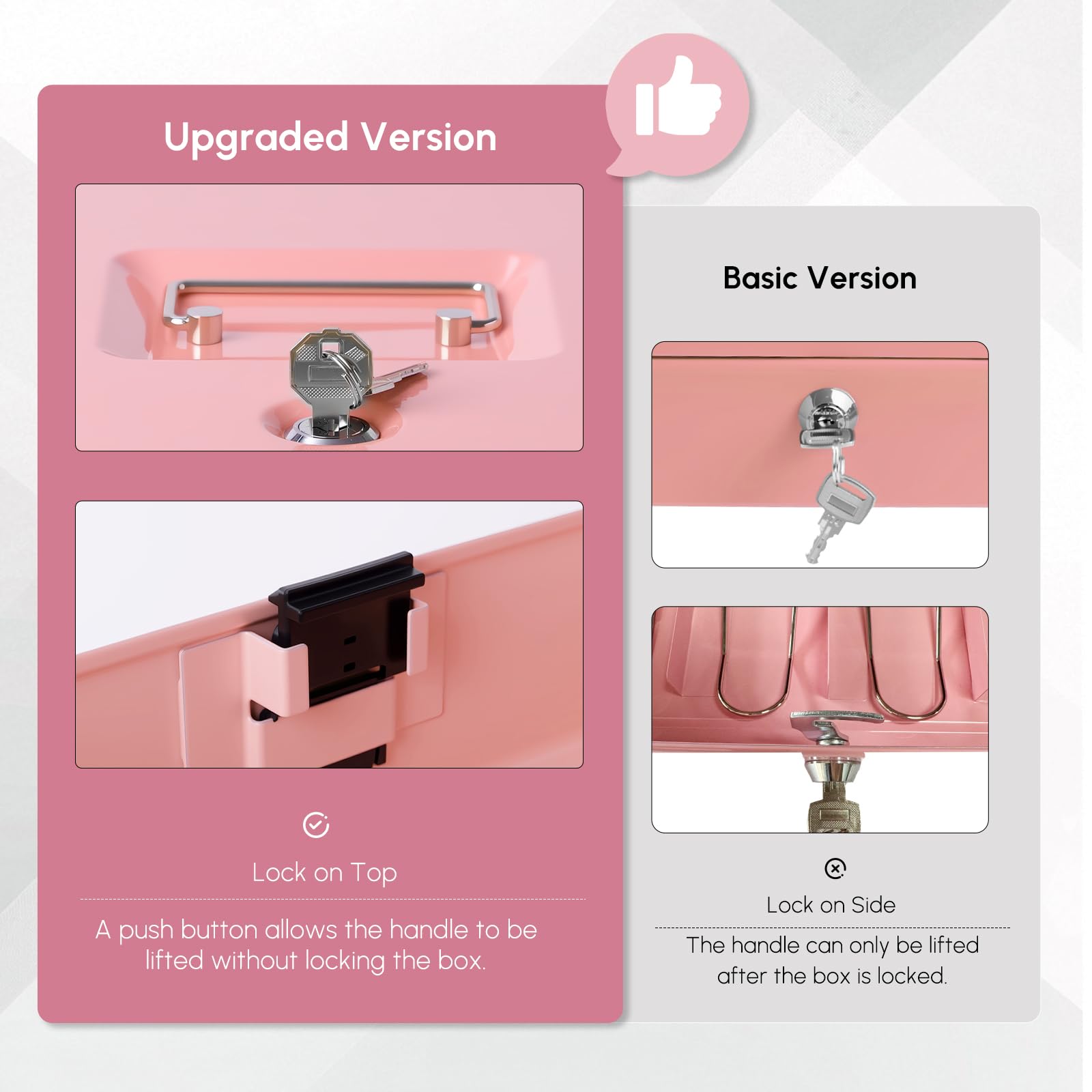 TOP Key & Push-Button Lock:The cash box is equipped with a key lock with two keys for privacy and security. Additionally, it features a push-button latch designed to prevent unintentional lid opening during transportation, thereby avoiding the spillage of coins and bills.