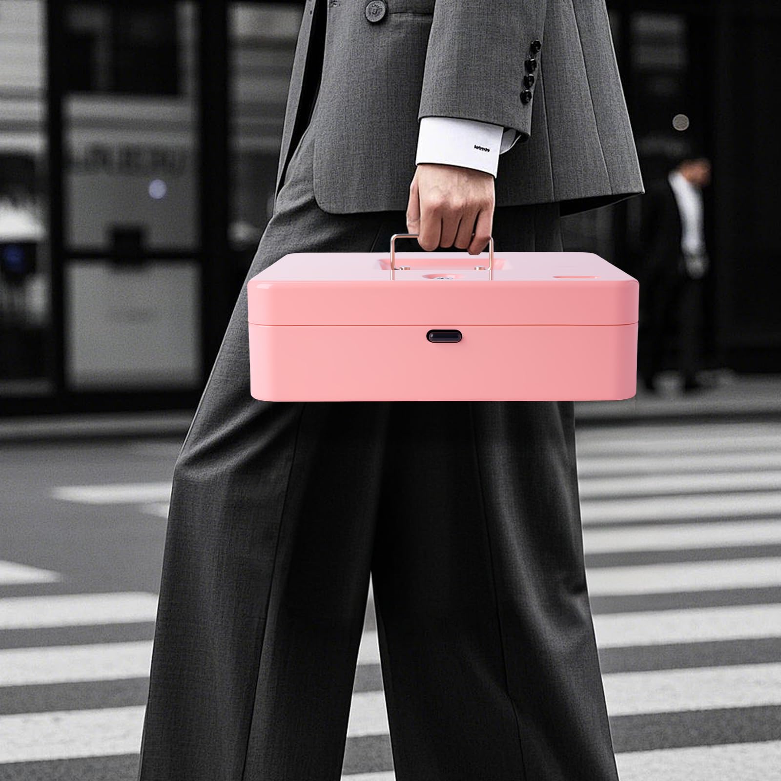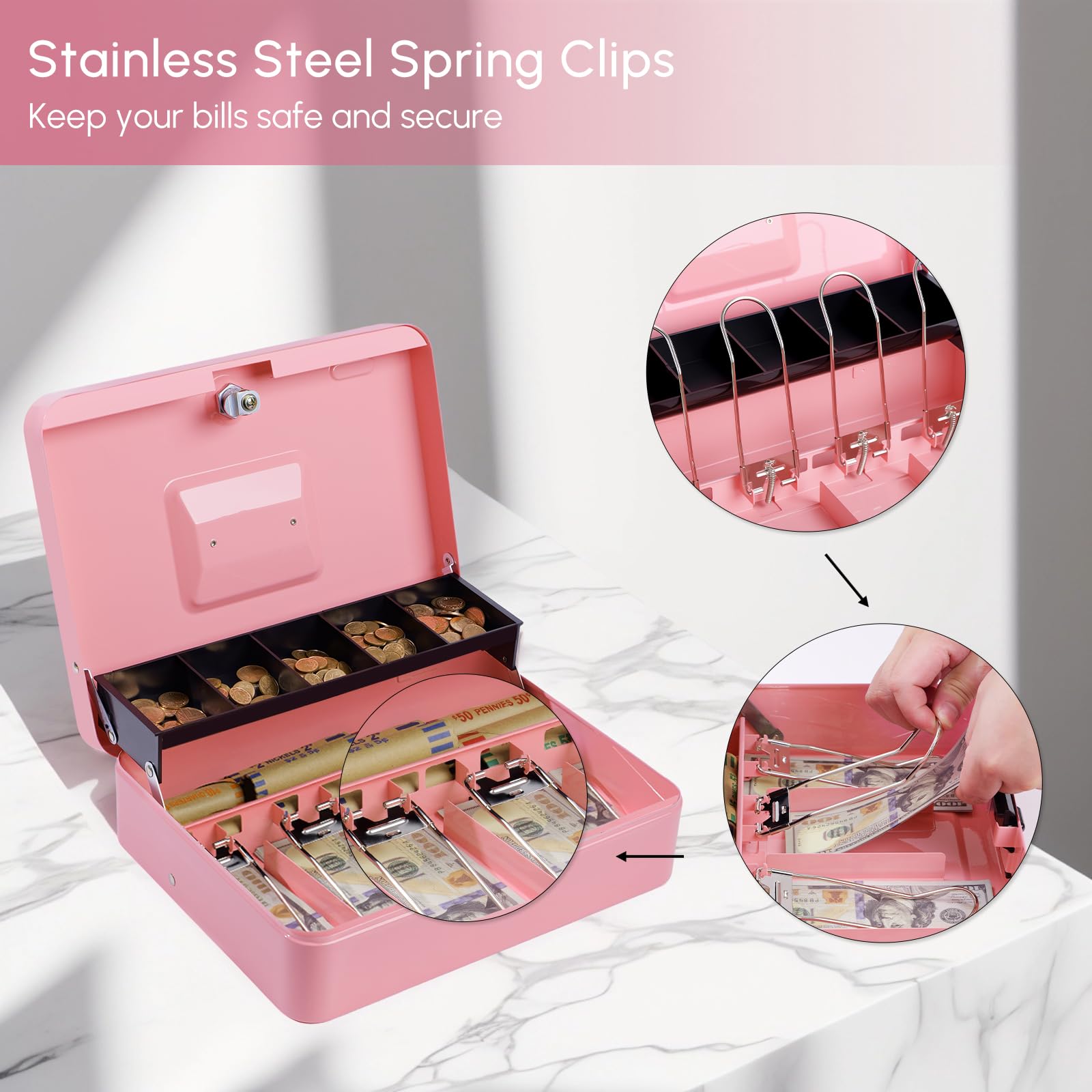 EASY TO USE: The money saving box features four spring clips that secure the cash in place and protect it from being blown away by wind when used outdoors. The stainless steel handle makes it easy to carry around, making it your perfect portable security solution for money.