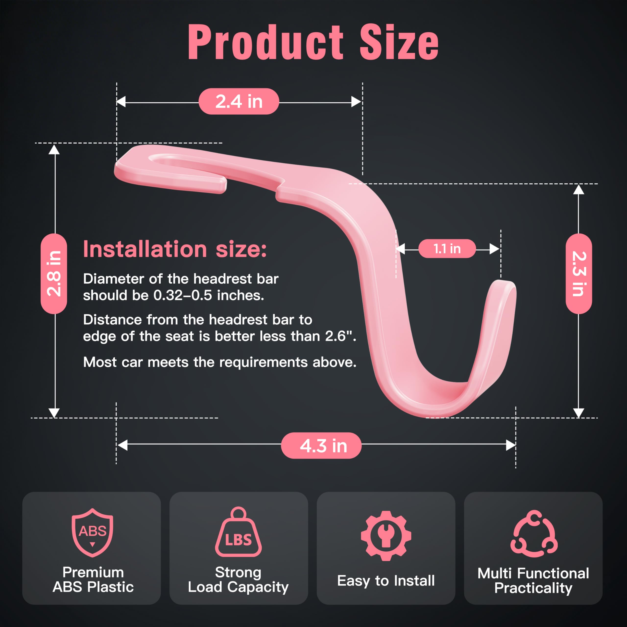 1.Material: this good is made of premium quality material. This item is wide & deep enough for your purse, backpack and so on. Installation size: 0.32-0.55 inch diameter of the headrest bar. Each item can hold up to 55 lb (25kg)