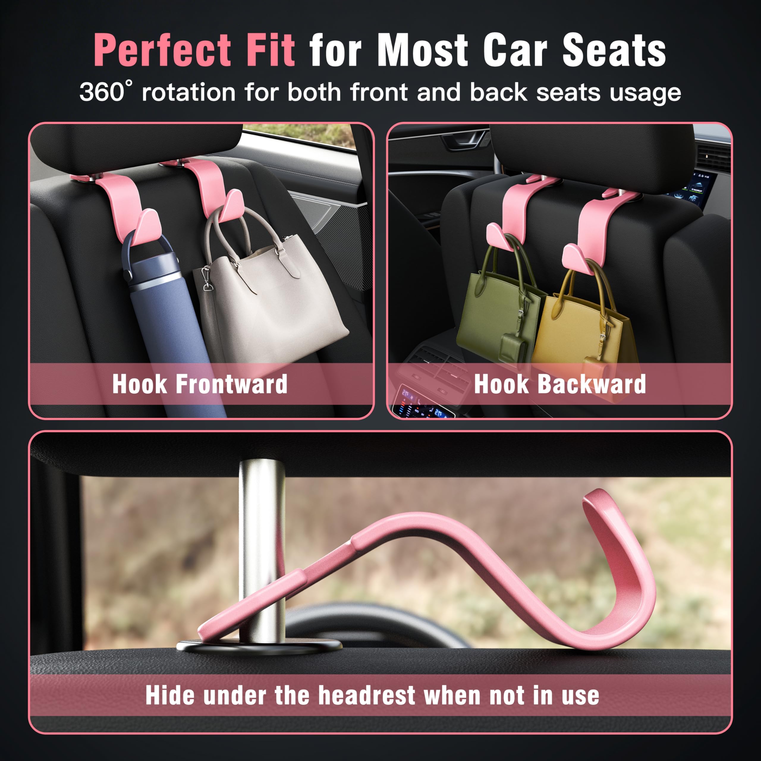 3.Contains 4 hangers, meet your multiple uses. The hooks can be rotated 360 degrees horizontally after installing. You can hide the hook when not use, Space saving and perfect compatible with your car.