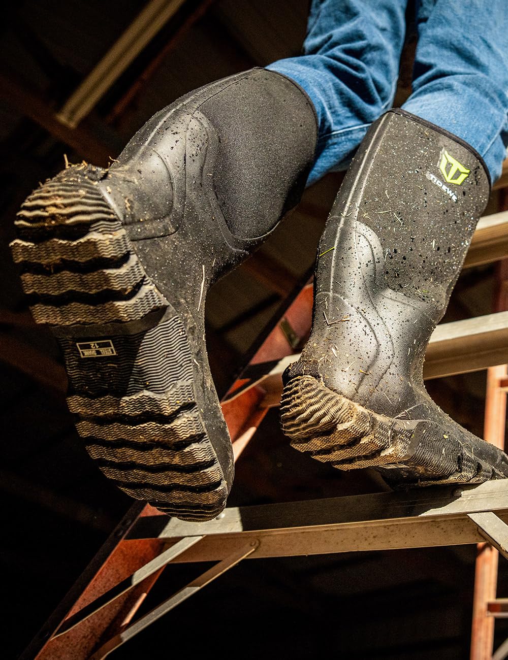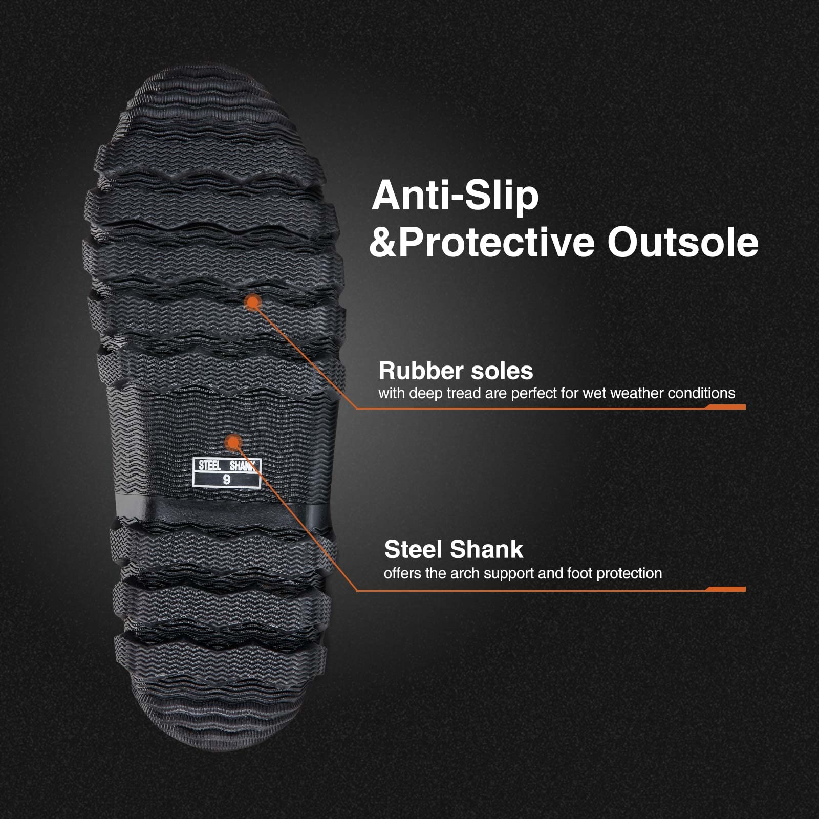【Sturdy & User-Friendly】To provide added support and durability to the sole, TideWe installed a steel shank between the insole and outsole of the boot. The reinforced rubber shell also offers extra protection on the toe and heel of the boot. The pull-on and kick tab allow for easy on and off to get you out the door quicker.