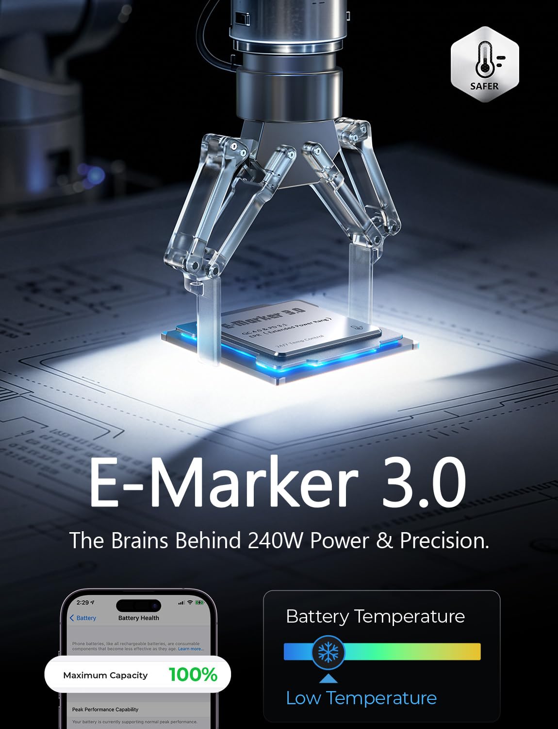 [E-Marker 3.0 Chip | Real-Time Current/Voltage Monitoring]: LISEN 240W type c charger fast charging cable has an E-Marker 3.0 + PD3.1 EPR system that actively monitors current/voltage 3.2M+ times per second, ensuring zero overloads, short circuits, or battery damage. Paired with dual safeguards (overheat + surge protection) and PD3.1/QC4.0 certifications, it's not just a USB-C to USB-C cable—it's a smart guardian for your devices