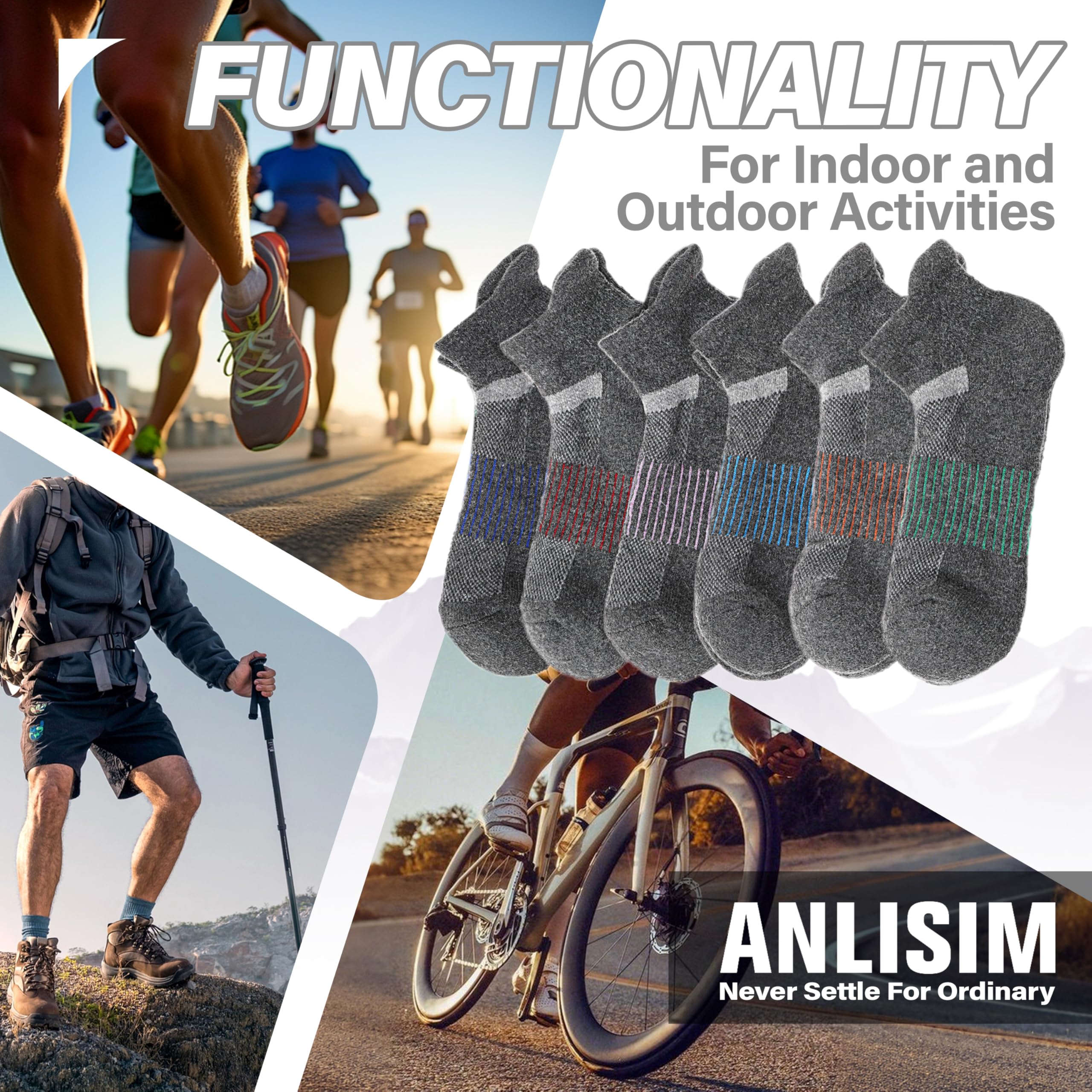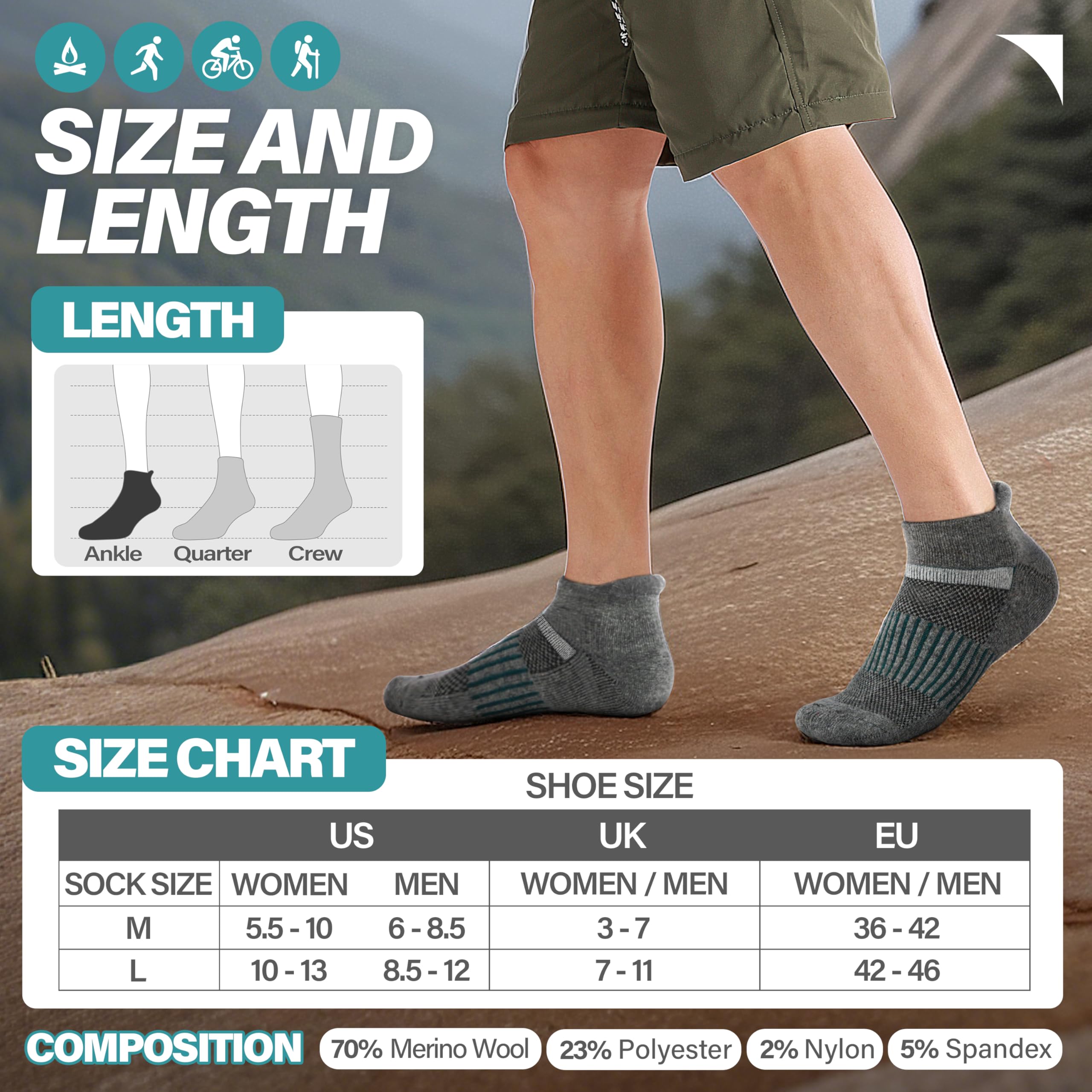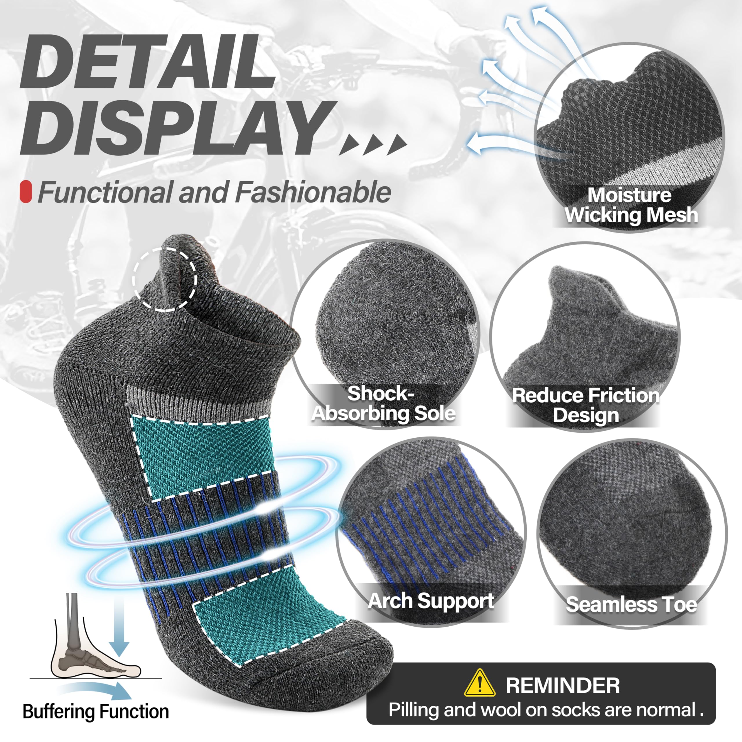 MOISTURE WICKING- By designing with ventilation mesh function, these wool hiking ankle socks are breathable and release heat, which keep feet dry quickly and have great help in odor repelling. They are suitable for hiking, running, outdoor walking , trekking or working.