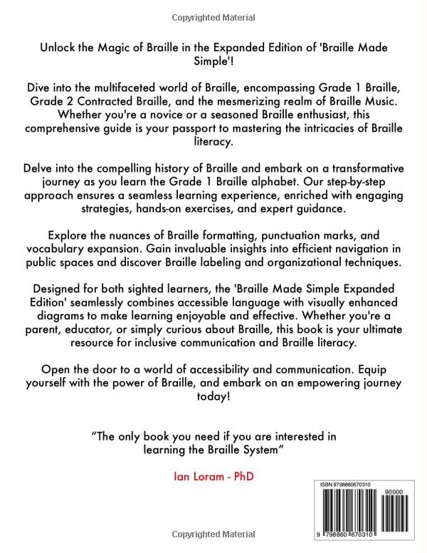 Introducing "Braille Made Simple - Expanded Edition: A Comprehensive Guide to Braille Literacy" 📚 Discover the Multifaceted World of Braille 📚 Are you ready to embark on an extraordinary journey into the realm of tactile communication? "Braille Made Simple - Expanded Edition" is the ultimate guide that opens the door to the captivating world of Braille literacy, encompassing Grade 1 Braille, Grade 2 Braille, and the enchanting domain of Braille Music. Whether you're a sighted individual seeking to expand your knowledge or an aspiring Braille learner, this comprehensive book is your key to understanding, reading, and writing Braille with confidence and proficiency. ✨ Explore the Chapters ✨ Delve into the rich history of Braille and its remarkable evolution. Master the Grade 1 Braille alphabet from A to Z with engaging learning strategies. Seamlessly transition into Grade 2 Contracted Braille and explore its advanced contractions. Unlock the mesmerizing world of Braille Music notation and composition. Uncover the secrets behind the special signs that shape the structure of Braille literacy. Seamlessly transition into numeric notation and discover the power of numbers in Braille. Unleash your writing skills with invaluable tools and techniques for Braille. Develop the art of forming individual Braille characters with precision and accuracy. Master proper Braille formatting techniques for enhanced readability. Embrace the punctuation marks that bring life and clarity to Braille. Build an extensive vocabulary and broaden your Braille reading repertoire. Journey through practical scenarios and confidently use Braille in everyday situations. Learn how to label, organize, and create accessible spaces with Braille labeling techniques. Seamlessly navigate public spaces and interpret Braille signage with ease. Unlock the power of efficient reading strategies and improve comprehension. Hone your writing skills and compose texts in Grade 1 and Grade 2 Braille. Explore the world of Braille Music through engaging practice exercises. 💡 What Makes This Book Stand Out? 💡 ✅ Thoughtfully designed chapters that cover the complete spectrum of Braille literacy. ✅ Inclusive approach catering to both sighted learners and blind or visually impaired individuals. ✅ Diagrams and visual aids strategically placed throughout the book to enhance understanding. ✅ Practical exercises that reinforce learning and promote hands-on experience. ✅ Expert guidance and learning strategies to expedite your mastery of Braille. ✅ Modern, accessible language that makes learning engaging and enjoyable. ✅ Insights into the historical context and modern applications of Braille. ✅ A comprehensive reference for educators, professionals, and anyone interested in Braille literacy. ✅ Special sections dedicated to the world of Braille Music notation and composition. 🌟 Unlock the World of Braille Literacy Today! 🌟 Unlocking Braille is your gateway to a powerful and inclusive form of communication. Embrace the future of accessibility, expand your horizons, and empower yourself with the skills to communicate effortlessly through Braille. Whether you're a parent, educator, or simply curious about Braille and Braille Music, this expanded edition is an essential addition to your collection. 🔒 Open the Door to Braille Literacy! Get Your Copy of "Braille Made Simple - Expanded Edition" Today! 🔓 Please note that the Braille in this book is printed rather than embossed and is not suitable for visually impaired persons.