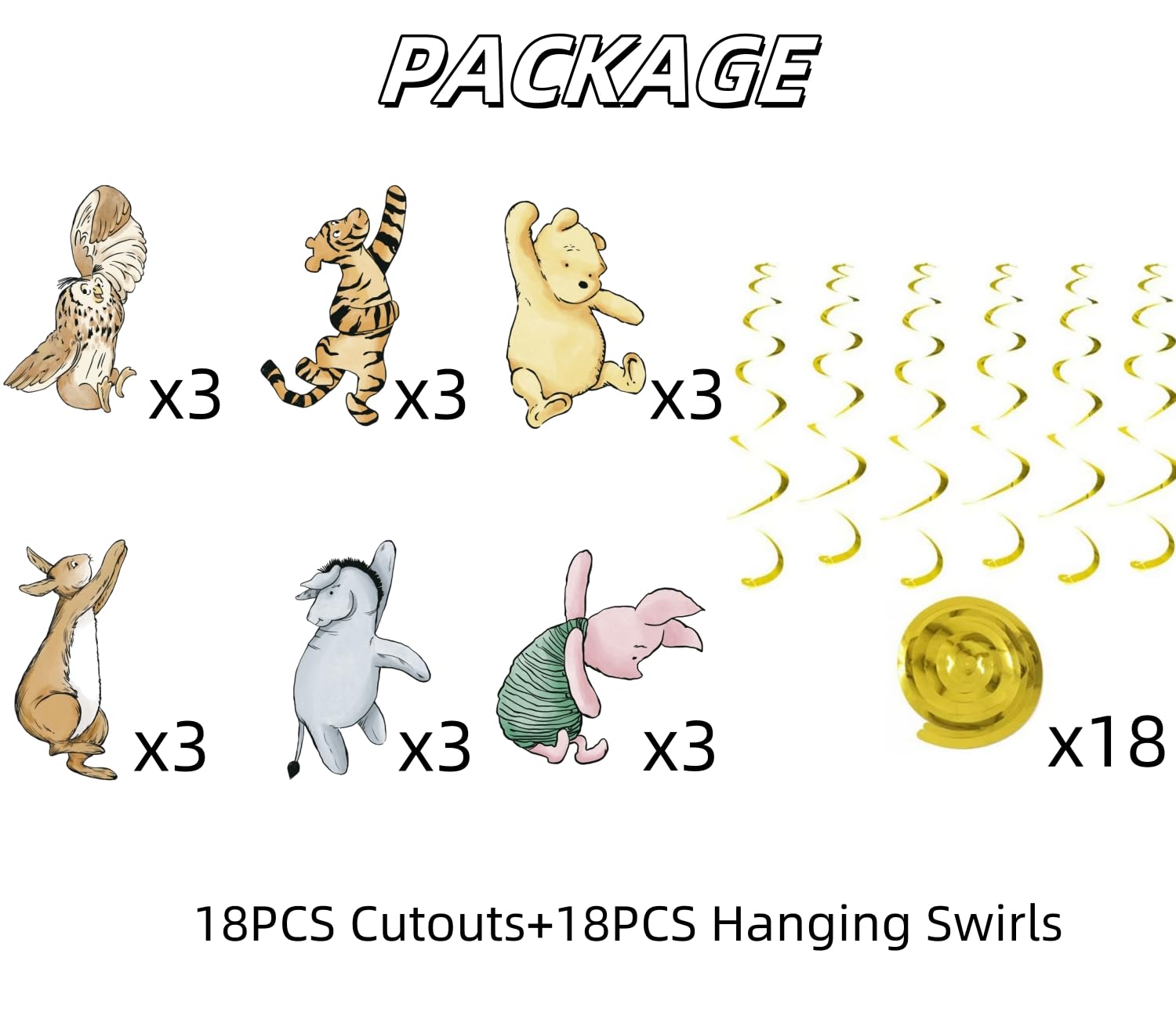 Package Included: You will get 18 PCS pooh themed cutouts and 18 PCS golden swirl streamers, very cute adding for party decor