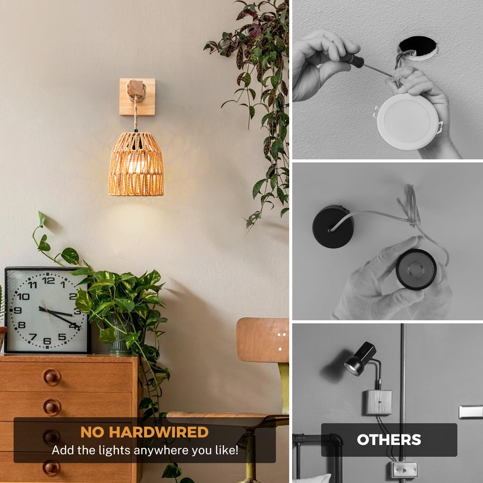 Wire-free Install - Add wireless sconces without needing an electrician! No hardwired mounting, the sconces wall lighting battery operated only takes a few minutes to install. The rattan battery wall sconces set of two helps you easily add light to any space and brings the room tropical breeze with boho chic in your home. (-The cage size: Diameter 6.8", Height 7.6")