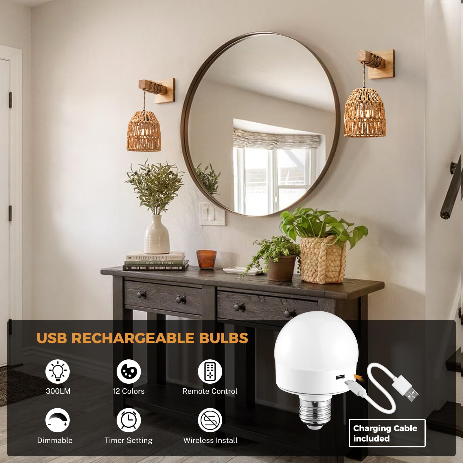 Package Included & Warranty - Glitnous indoor cordless boho battery powered wall sconce set comes with 2 wall lamps, 2 rechargeable LED bulbs, 2 remote controls, 2 USB charging cable (Type-C), mounting screws. All Glitnous wall sconces come with a 12-month warranty. If you have any questions before or after purchase, please feel free to contact us.