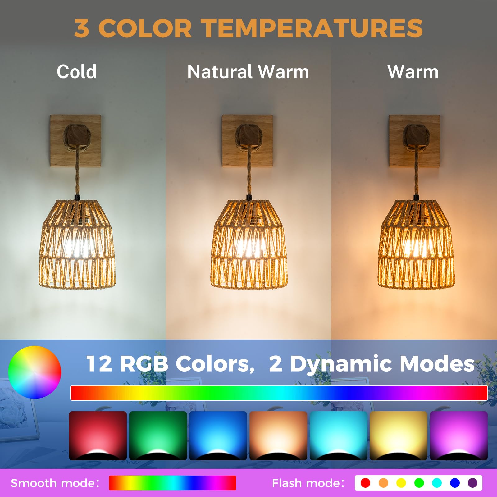 3 Color Temperatures & 12 RGB Colors - The rechargeable wall sconce has 3 color temperatures: 3500K Warm, 4500K Natural Warm, and 6500K Cold White. The wall sconces set of two battery operated with additional 12 RGB colors and 2 dynamic ambience light modes will bring you more joy and surprises.