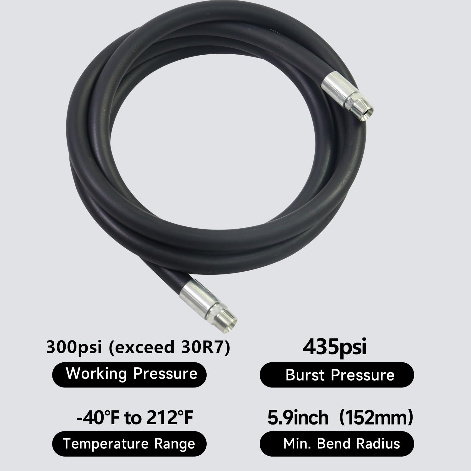 Size and Specifications: This hose measures 10 feet in length with a 3/4" NPT connector, ideal for efficient fuel transfer. It operates at a max pressure of 300 PSI and a bursting pressure of 435 PSI, with a temperature range of -40 °F to 212 °F.