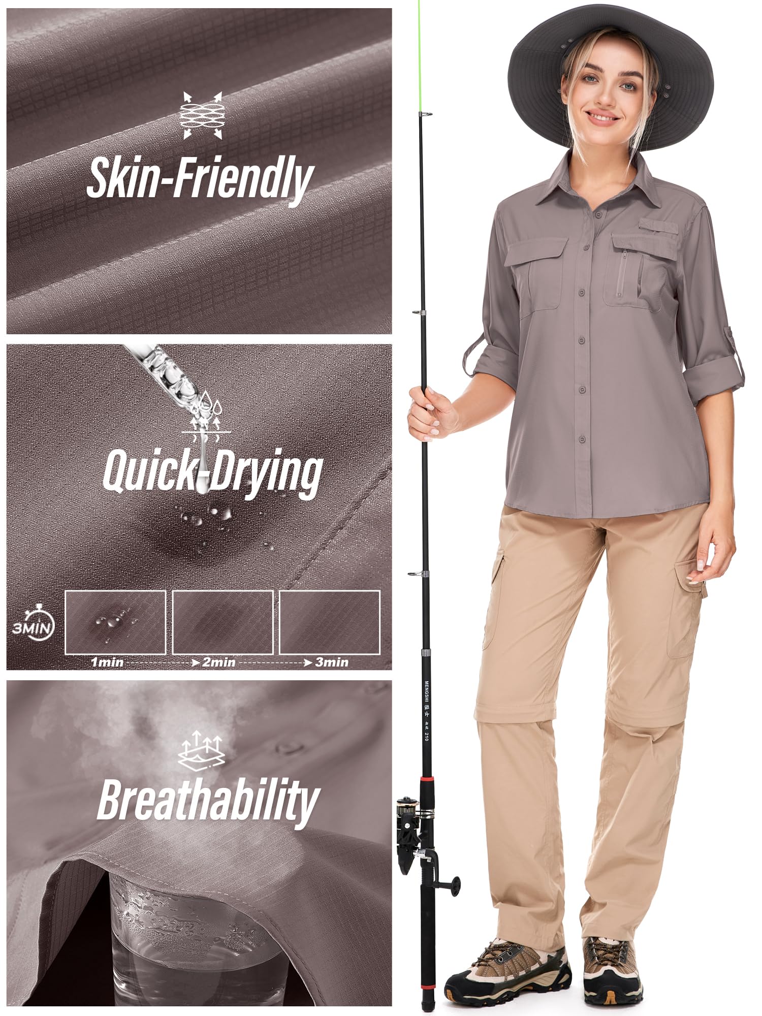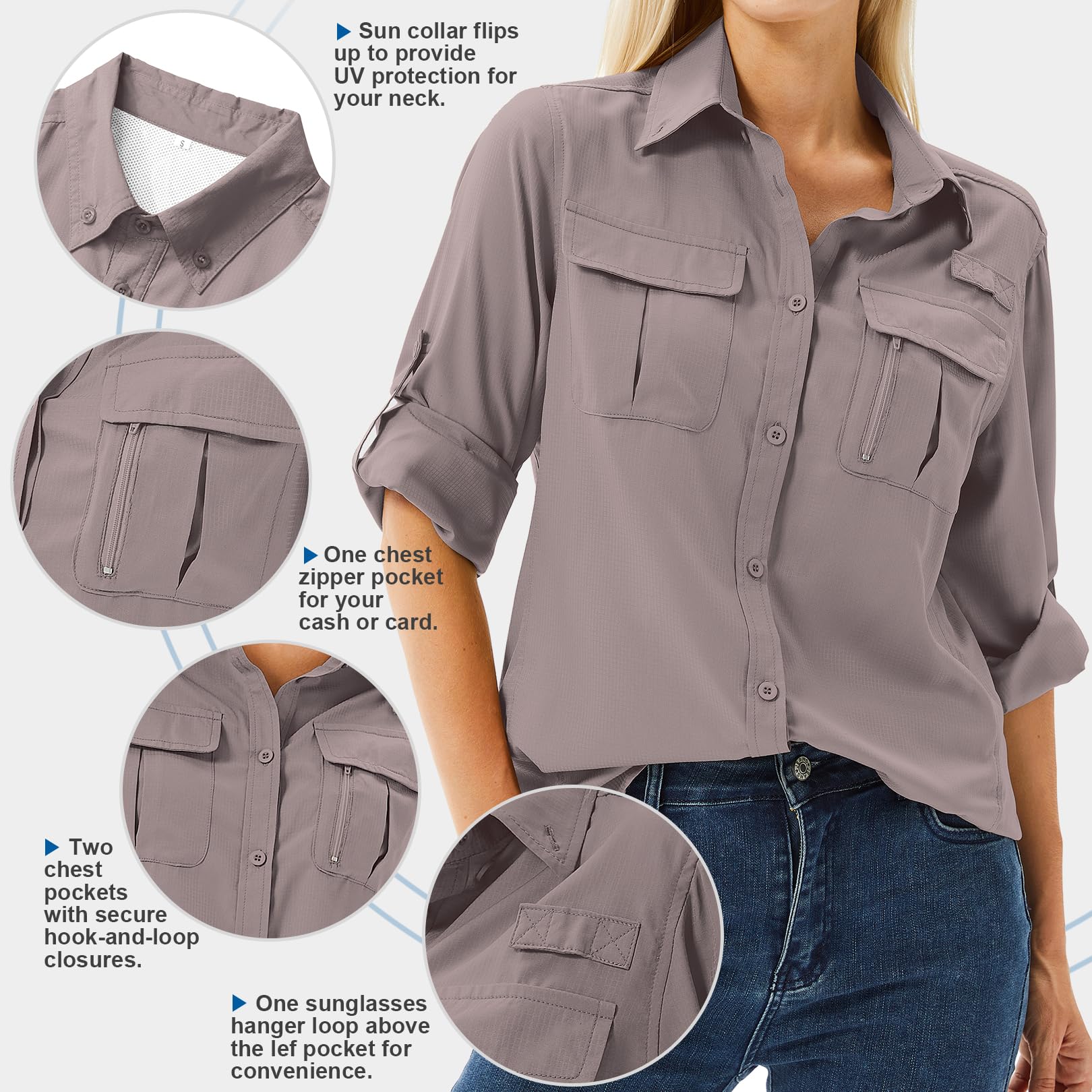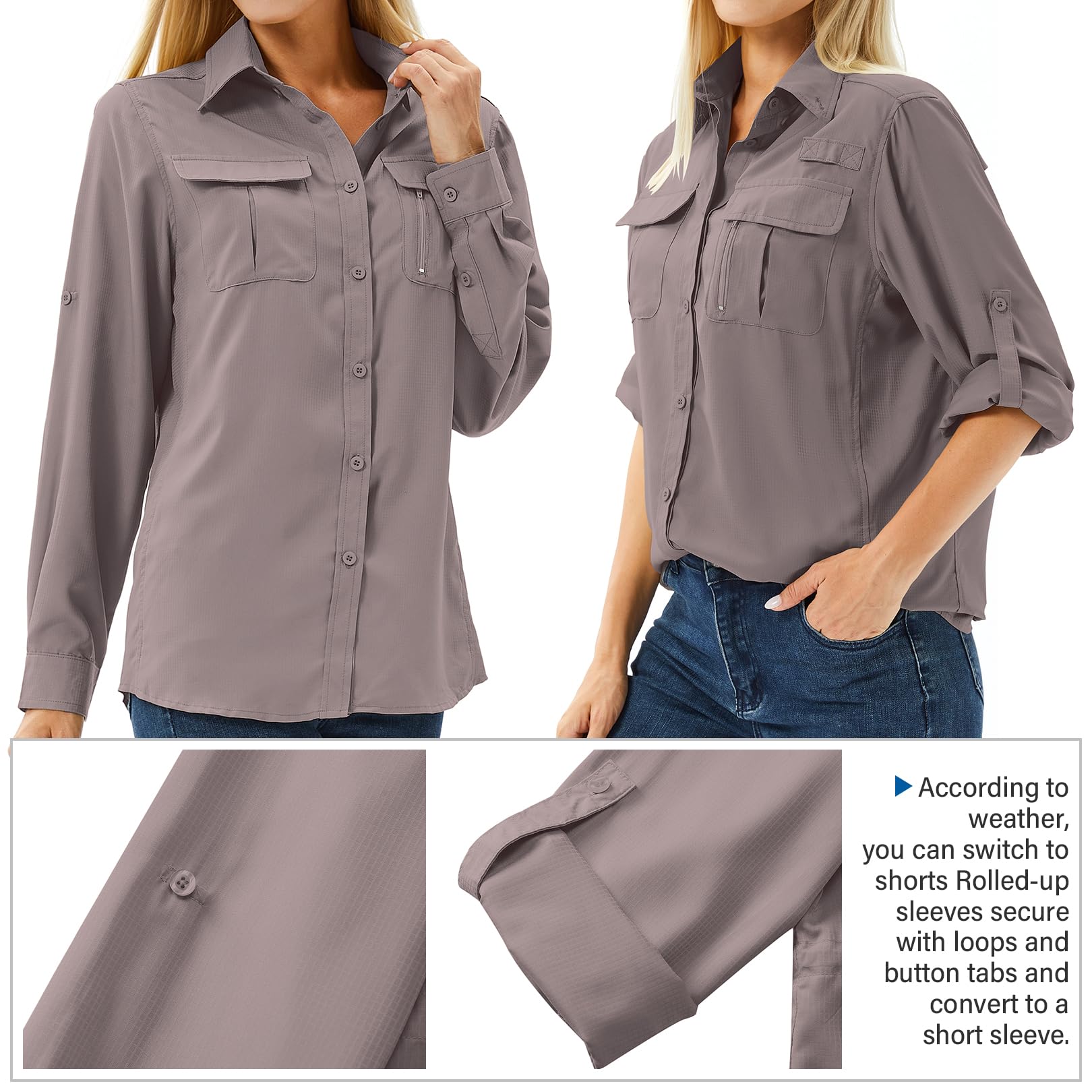 Hiking Shirts Women:Our long sleeve button up shirts for women feature a mesh lined vented back for breathability and comfort.Rolled up sleeves secure with loops and button tabs,and convert to short sleeve,making it adjustable according to weather and temperature to prevent sunburn or cold.