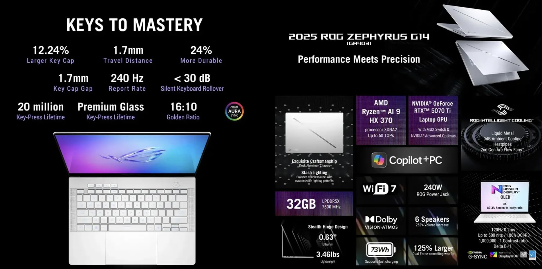 Processor: Ryzen AI 9 HX 370 2.00GHz Processor (Zen 5 Gen, upto 5.1 GHz, 24MB Cache, 12-Cores, 24-Threads, ) Storage: 2TB PCIe SSD (Solid State Drive) Memory: 32GB OnBoard LPDDR5X RAM Graphics: NVIDIA GeForce RTX 5070 Ti 12GB GDDR7 Dual (Integrated+Dedicated) Graphics, VR Ready Operating System: Windows 11 Pro-64 Connectivity: 802.11be, Bluetooth 5.3, Camera: Webcam Input/Output:, White, RGB KB Standard Keyboard, Display: 14.0" OLED 2.8K (2880x1800) 120Hz 16:10 Display Ports/Slots:, HDMI, USB 3.2 Type-C, SD Card Reader, Headphone/Microphone Combo Jack Battery: 200W PSU, 4-Cell 73 WHr Battery Color: Platinum White Form/Style: Standard Product Dimensions (WxLxH): 8.7 IN x 12.3 IN x 0.8 IN Weight: 3.5lb