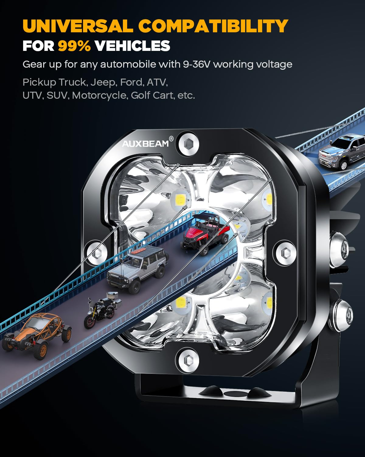 【BUY IT WITH CONFIDENCE】Auxbeam offers 24 months guarantee and friendly customer service responses within 24 hours, please feel free to contact us if you need any assistance. Our led pods are ideal for any kind of 9-36V Off-Road, ATV, UTV, SUV, Construction, Farming, Truck, Pickup, Bus, Boat, etc.