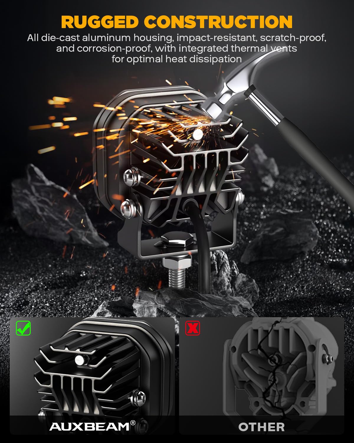 【STURDY CONSTRUCTION】Auxbeam 3" off-road lights feature a rugged die-casting aluminum body and polycarbonate lens cover that is solid, resistant to wear and fade, IP68 rating, with breathing valve and waterproof seal connection for use in all weather conditions. Leading fog light pods lifespan is over 50,000 hours.