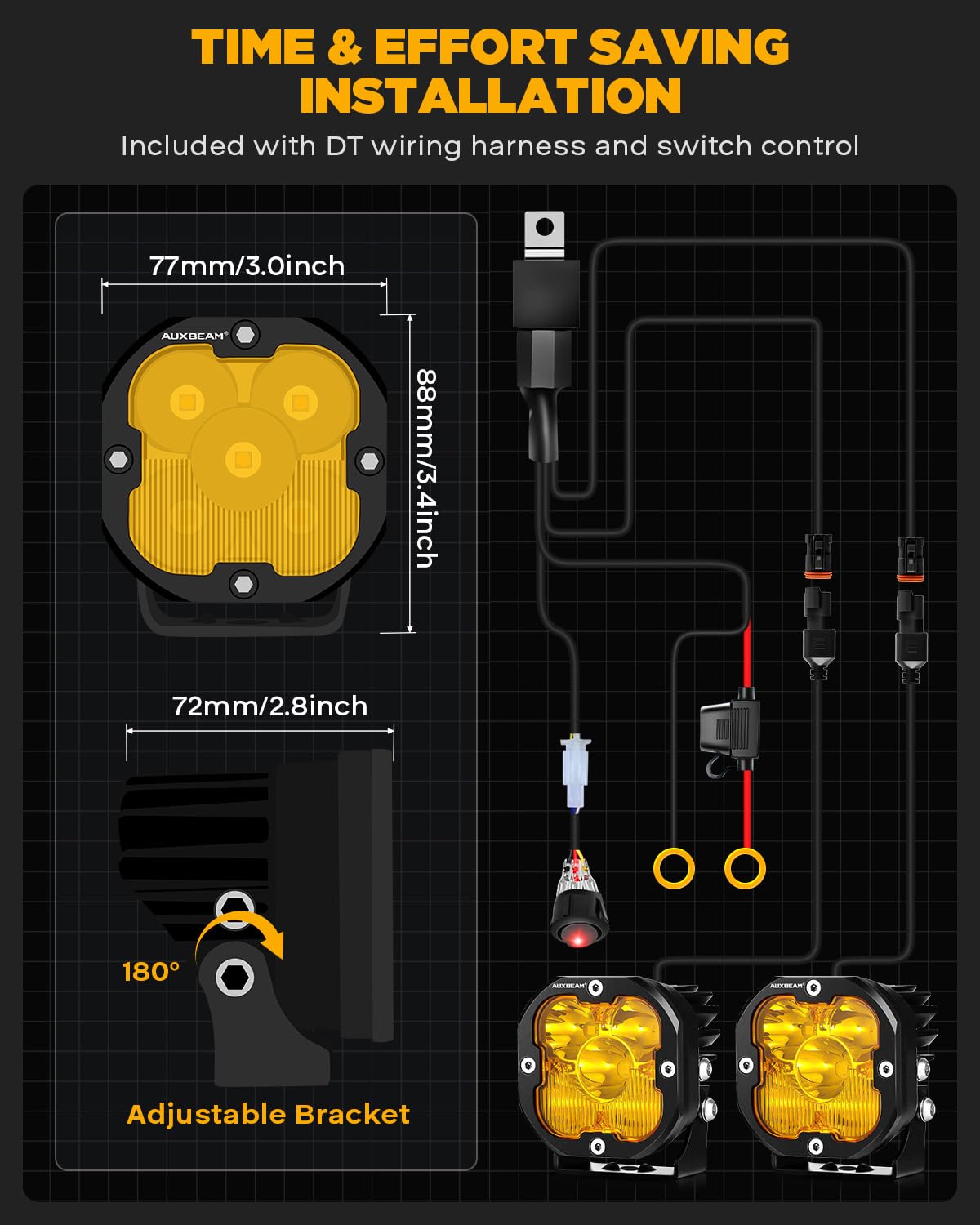 【PLUG-AND-PLAY DESIGN】Comes with 2 lead DT plugs wiring harness kit include fuse relay and switch all in a set, adjustable thick stainless steel mounting brackets which can be swiped over 90 degrees, pretty easy for installation and quick to hook up.
