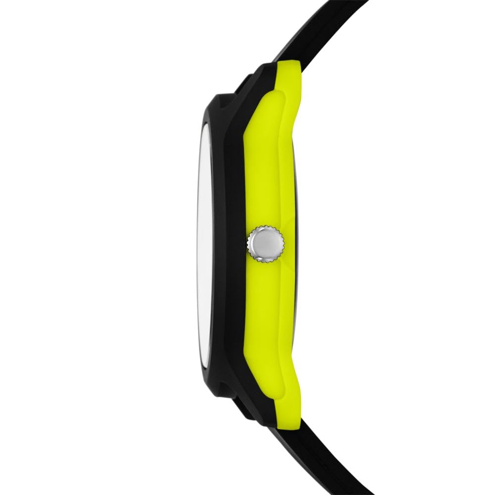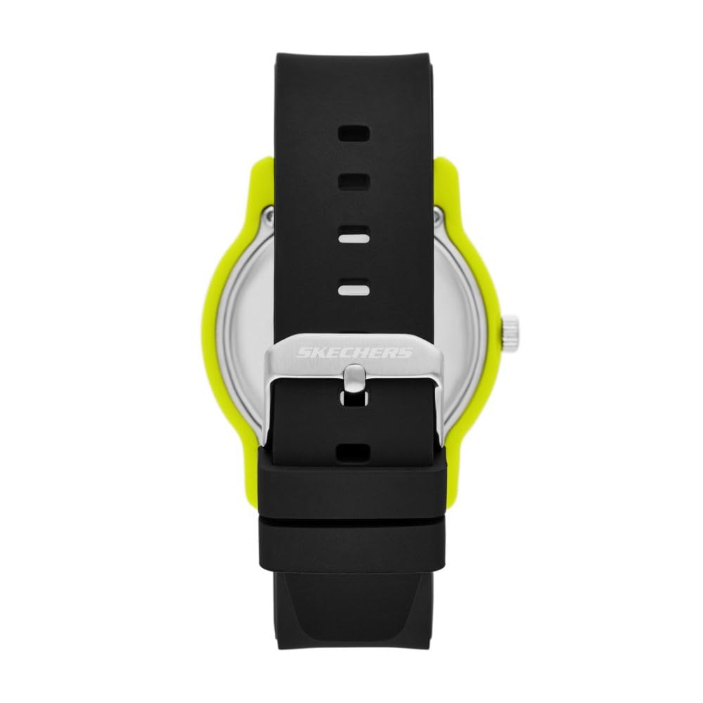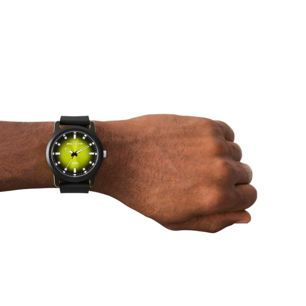 The Skechers Ostrom quartz analog watch features a black and bright green dual-tone plastic case with degrade dial and black silicone strap.