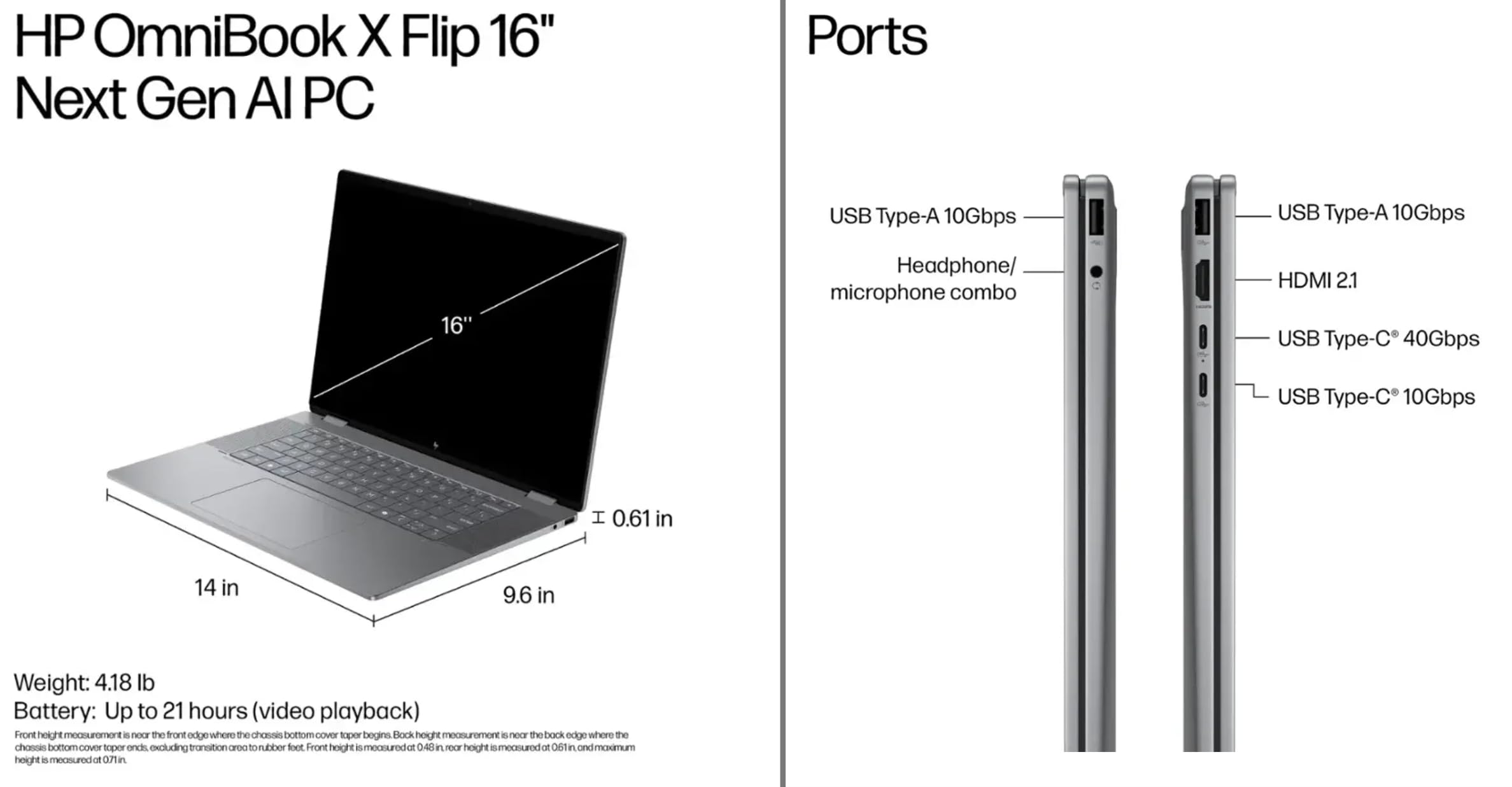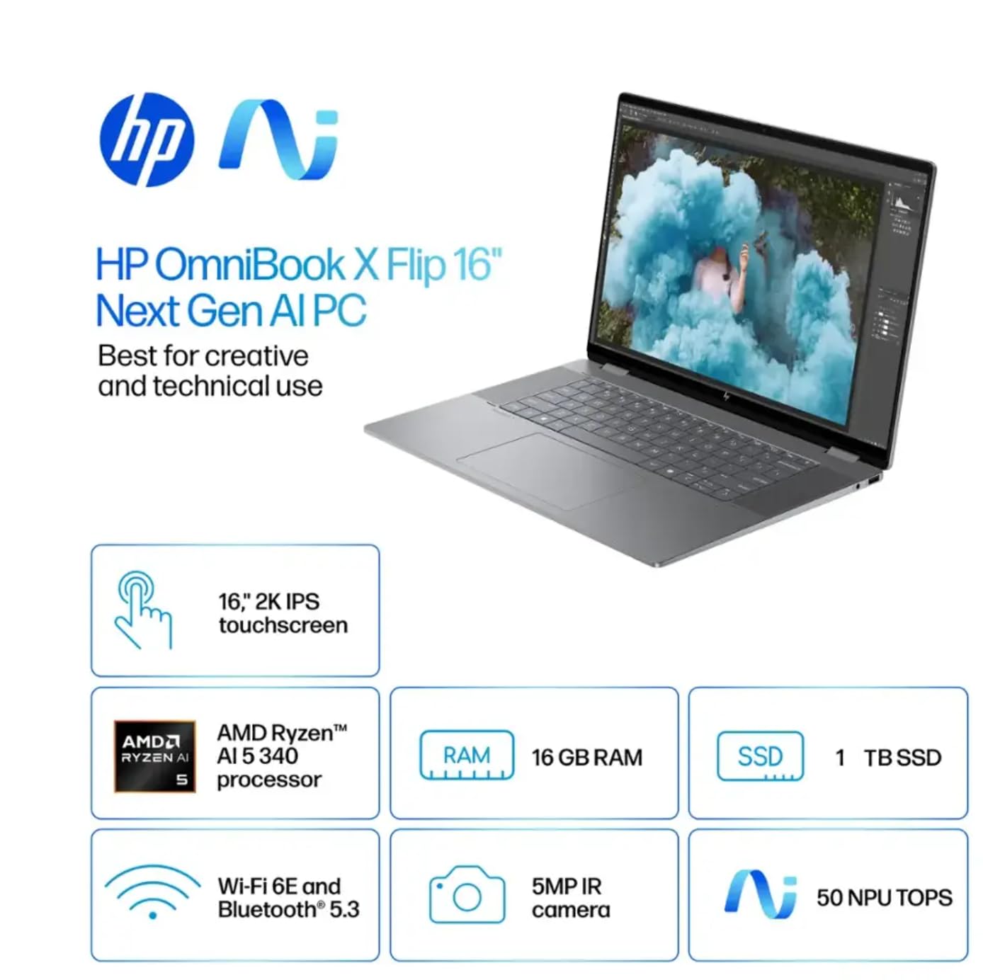 【Product Features】 Unlock AI Power & Versatility: HP OmniBook X Flip Copilot+ PC Laptop Experience the next generation of computing with the HP OmniBook X Flip 2-in-1 Laptop. Designed as a Microsoft Copilot+ PC and powered by the advanced AMD Ryzen AI 5 340 processor featuring a dedicated 50 TOPS Neural Processing Unit (NPU), this laptop brings transformative on-device AI capabilities to your fingertips. Enjoy accelerated productivity, enhanced creativity with tools like Paint Cocreator and Live Captions, and seamless responsiveness within Windows 11 Home – all powered efficiently on the device itself. Immersive Touchscreen Experience Engage with brilliant clarity on the expansive 16-inch Full HD+ (1920 x 1200) touchscreen. The vibrant IPS panel delivers 400 nits brightness, wide 178-degree viewing angles, and AMD FreeSync technology for smooth visuals. The intuitive edge-to-edge glass touch display, combined with the flexible 360-degree hinge, lets you effortlessly transition between laptop, tablet, tent, or stand modes for work, collaboration, or entertainment. Efficient Performance for Everyday & Creative Tasks Tackle your workflow confidently with the capable 8-core AMD Ryzen AI 5 340 processor (up to 5.0 GHz boost), integrated AMD Radeon 840M graphics, 16GB of fast LPDDR5X RAM (7500 MHz), and a speedy 512GB PCIe Gen4 NVMe SSD. This combination provides the power for smooth multitasking, quick application loading, and ample storage for essential files, applications, and creative projects. Designed for Mobility & Endurance Built for life on the go, the sleek aluminum chassis is remarkably thin (0.61 inches) and portable (4.43 lbs). The standout feature is exceptional battery life – experience up to 21 hours of video playback on a single charge, empowering you to work, learn, or stream throughout your day without interruption. The premium backlit keyboard ensures comfortable typing in any lighting condition. Enhanced Collaboration & Entertainment Look and sound your best with the high-fidelity HP 5MP IR camera featuring HDR and a privacy shutter, plus Poly Studio-tuned dual speakers enhanced with DTS:X Ultra for immersive, spatially accurate 3D sound. Stay connected at top speeds with the latest Wi-Fi 6E (2x2) and Bluetooth 5.3. Connect all your essential peripherals and external displays with ease using the comprehensive port selection: 1 x USB-C 4 (40Gbps, USB PD, DP 2.1), 1 x USB-C 3.1 (10Gbps, USB PD, DP 2.1), 2 x USB-A 3.1 (10Gbps), 1 x HDMI 2.1, and a headphone/microphone combo jack. Responsibly Engineered HP is committed to sustainability. This OmniBook incorporates recycled materials, including ocean-bound and post-consumer recycled plastic and recycled metal, and carries ENERGY STAR certification and EPEAT Gold registration. Your Complete Package Includes HP OmniBook X Flip 2-in-1 Laptop (Meteor Silver); Windows 11 Home; 65W Power Adapter; 1-Year Limited Hardware Warranty.
