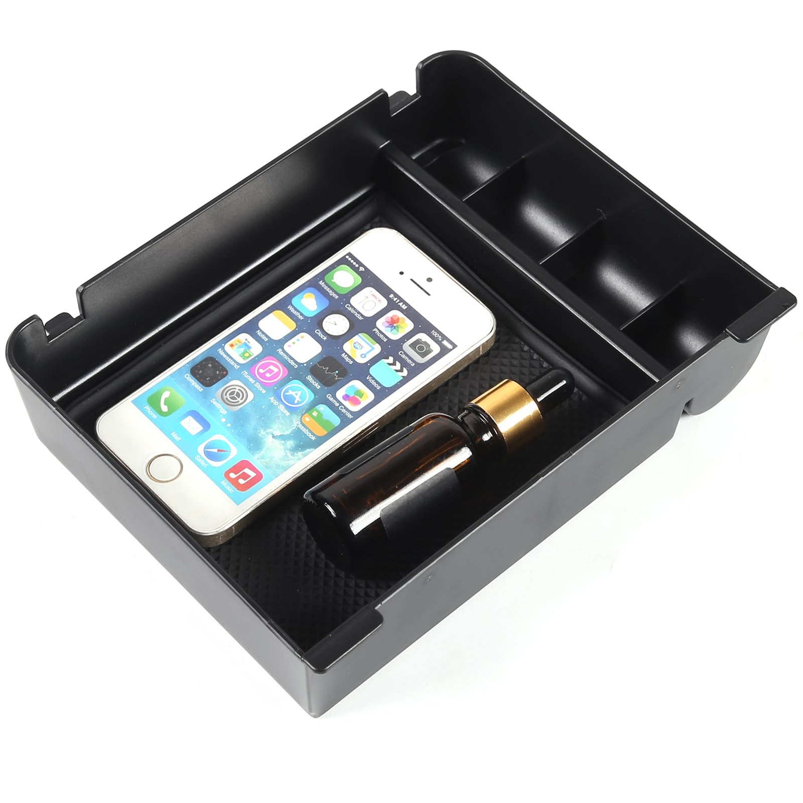 【Organized Storage Space】:This armrest organizer box provides an organized divider for sunglasses, masks, wallets, pens, and other essentials without cluttering your car. It prevents items from rolling around so they don't interfere with your normal driving experience. Its stable, sturdy and non-slip design ensures that your items are stored safely. All essentials are within reach and neatly organized