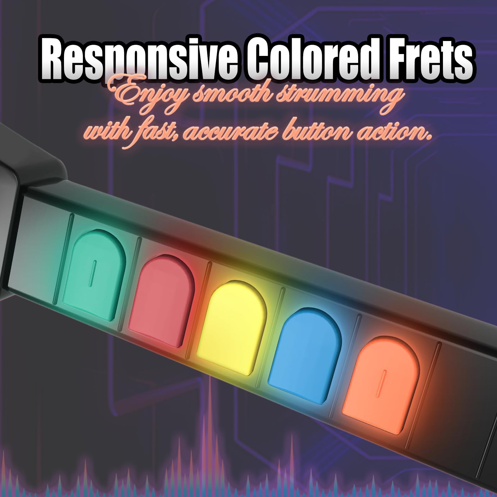 🟢 Responsive Fret Buttons – Enjoy smooth, colorful button controls for fast strumming.