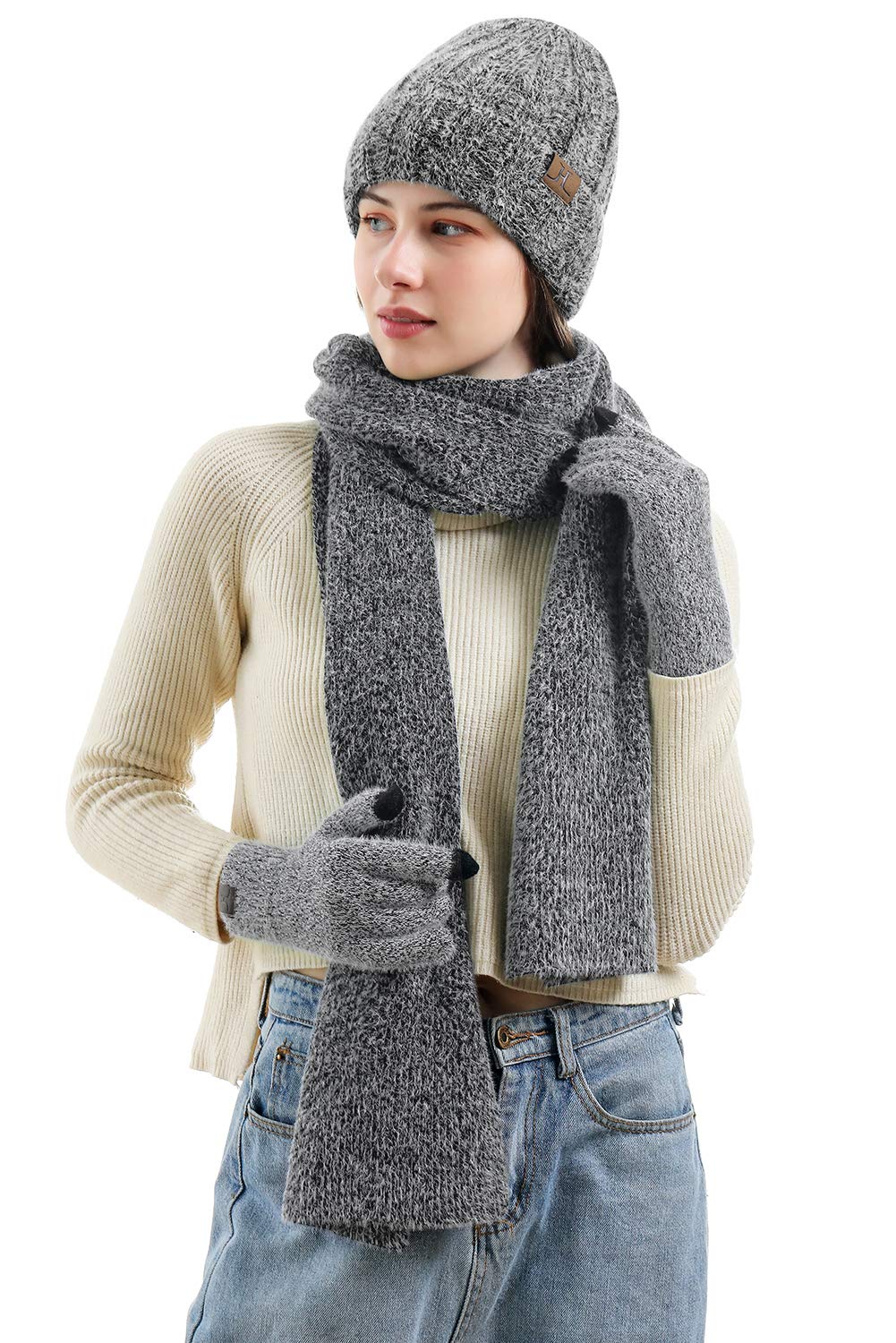 【Classic Style Knitted Hat Scarf Gloves Suits】Precise knitting crafts creates a beautiful and fashionable design that can be matched with most formal and casual clothing. Wonderful for women wearing while skiing, skating, sledding, camping, driving or any outdoor winter sports and daily use. Package Included: 1× Winter Beanie Hat + 1× Touchscreen Gloves + 1× Long Scarf (3 in 1 set);