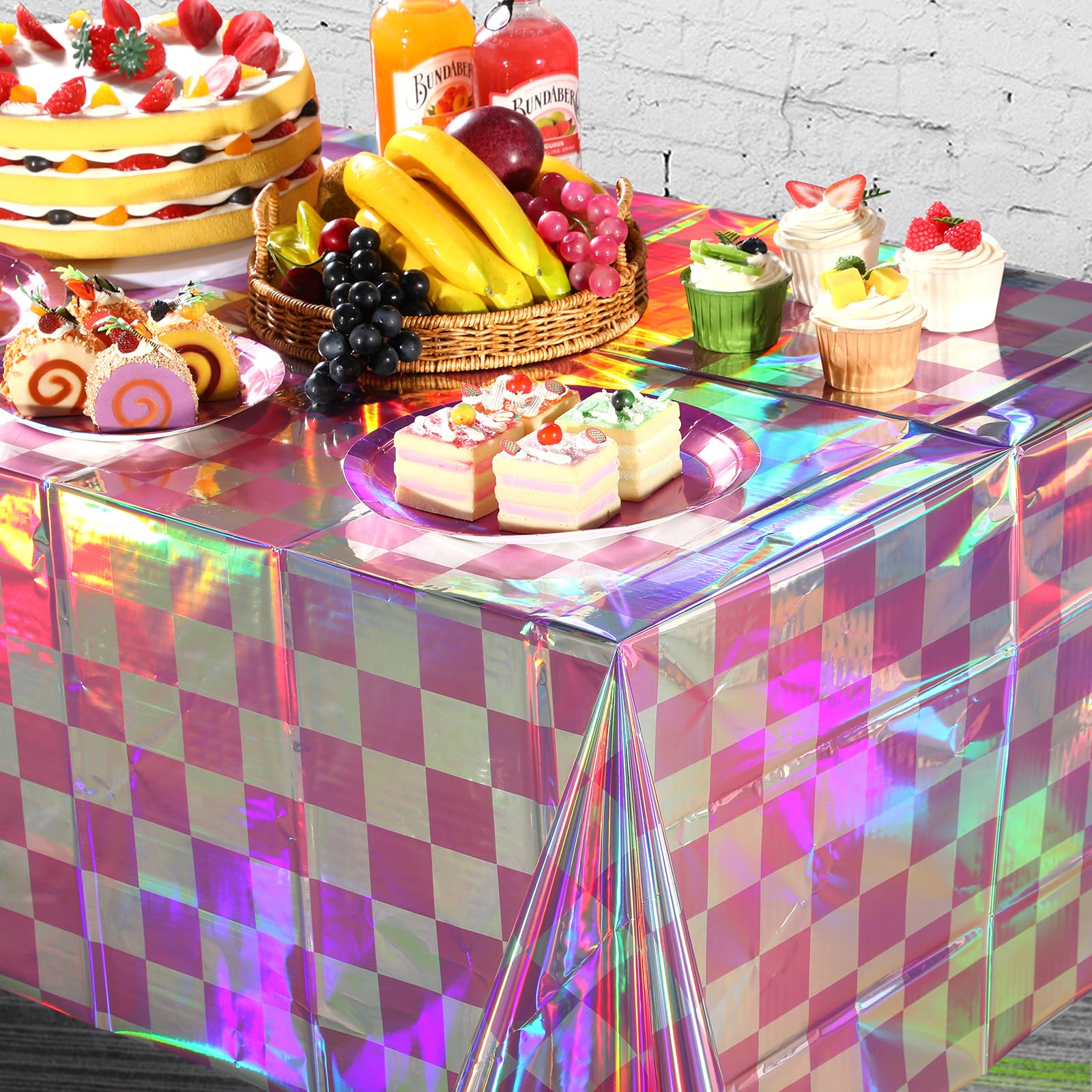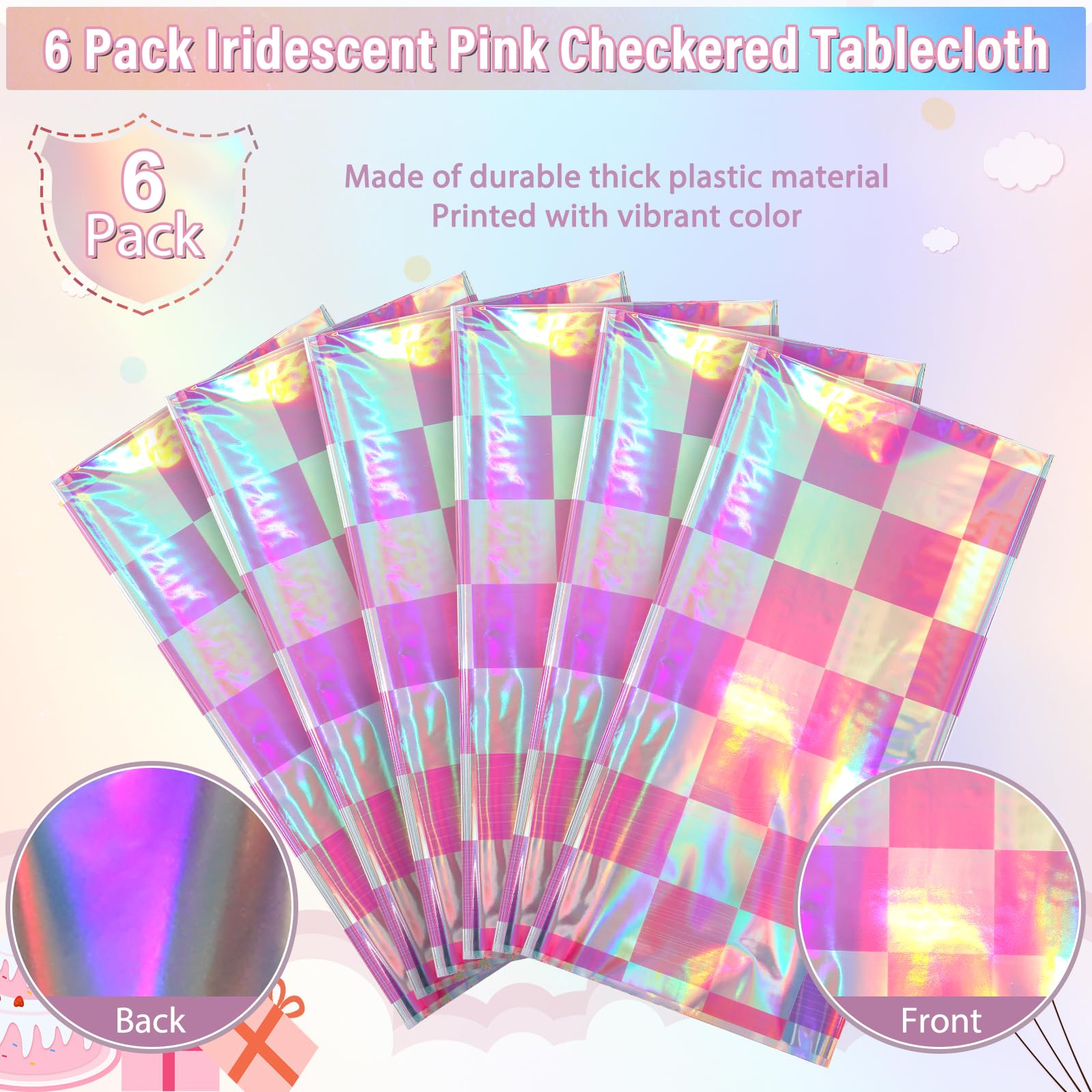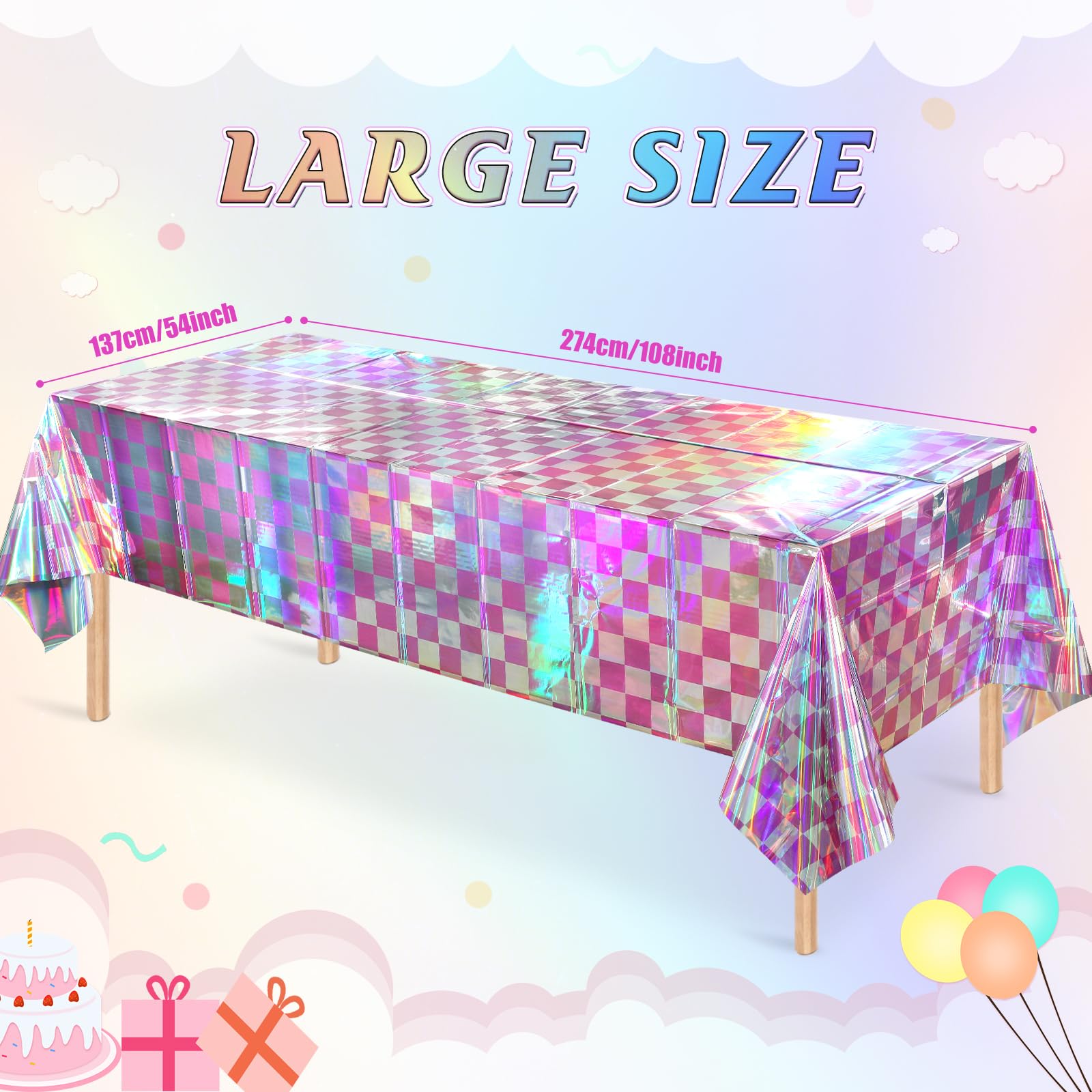 Package Includes: You will receive 6 pink and iridescent checkered plastic tablecloths. Each iridescent pink table cover measures approx 54 x 108 inches, fits any rectangular table up to 8 feet in length, suitable for party decoration.